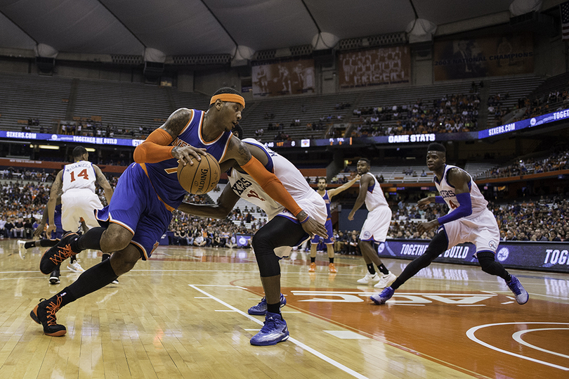 Former Syracuse standout Carmelo Anthony moves past a defender in the New York Knicks' 84-77 win over the Philadelphia 76ers in the Carrier Dome on Tuesday night. He returned with SU products Michael Carter-Williams and Jerami Grant, who did not play but are on the 76ers. Michael Cole | Staff Photographer
