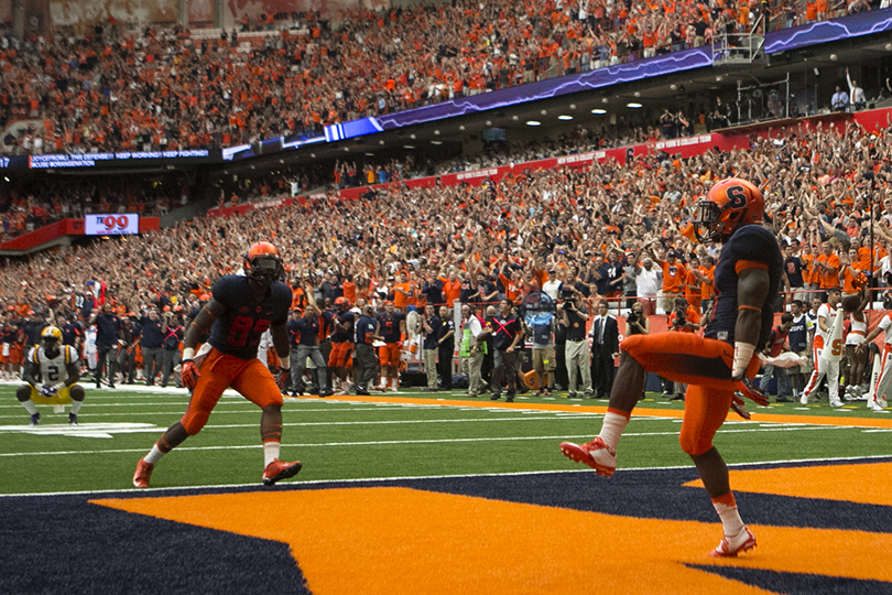 Brisly Estime (right) scored a touchdown against South Florida and will be key for Syracuse's offense against Connecticut. Daily Orange File Photo
