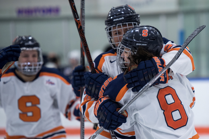 With 4:30 remaining in the first period, Syracuse forward Savannah Rennie passed the puck across the ice to teammate Brooke Avery, who clanged the puck off the top right of the goal post and in to give SU a 2-0 lead. Ninety seconds later, junior forward Sarah Stuehr found herself in the right place at the right time. A shot attempt from teammate Lindsay Eastwood ricocheted off Lindenwood goalie Jolene deBruyn directly to Stuehr, who slid the puck between the legs of Lindenwood’s goaltender and in for her first goal of the season, and second of her career.
