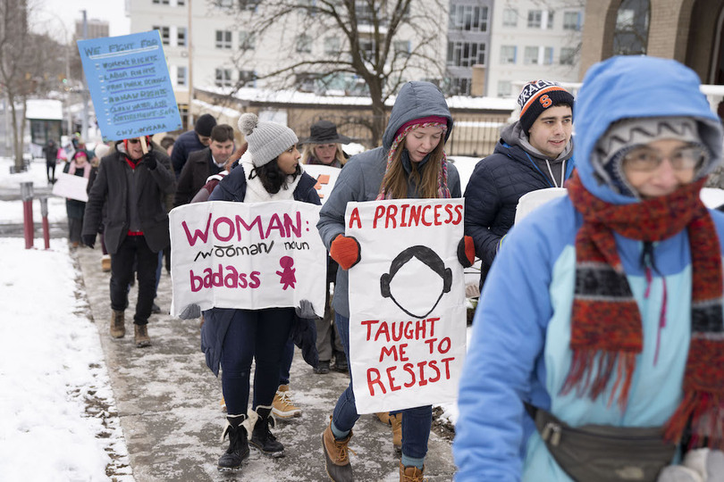 This year, more than 100 protesters filled city sidewalks as they marched through the snow from the James M. Hanley Federal Building to the United Methodist Church. Many carried signs advocating for women’s rights, healthcare, climate change awareness and an end to gun violence.