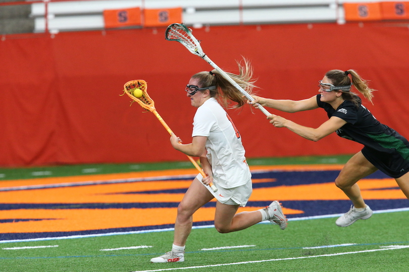 Despite the early mistake, Syracuse settled into a rhythm and scored two goals at the free position to kick-start an offensive onslaught. The Orange outshot the Greyhounds 31-29 throughout the 60 minutes.
