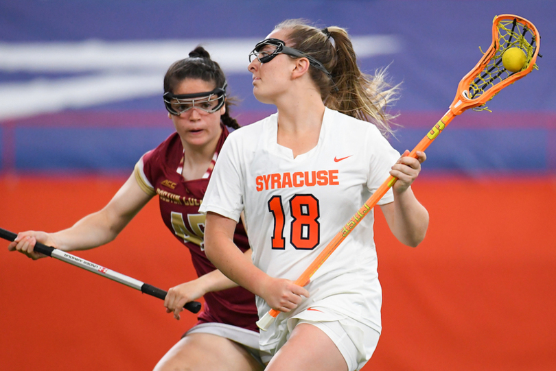 Hawryschuk launched an underhand low-to-high shot similar to Ahern’s and nestled it into the top of the net past Deehan. The goal extended SU’s lead to 10-8 going into the halftime break and Hawryschuk finished the first half with a hat trick.
