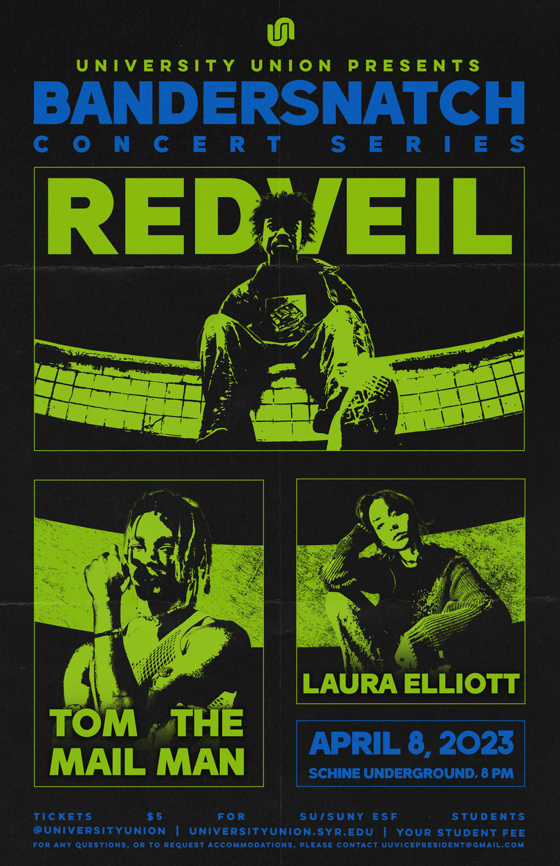 University Union’s second Bandersnatch concert of the semester will take place on Saturday, April 8 at Schine Underground. redveil, Tom the Mail Man and Laura Elliott will be featured at the show. Courtesy of University Union