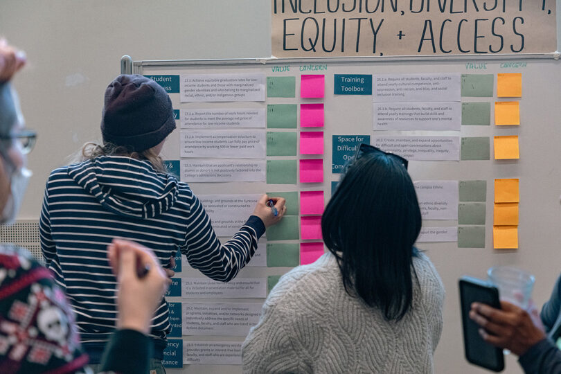 The campus community is invited to review and provide feedback on ESF’s first Sustainability Action Plan draft. Different colored pens represented students, faculty or staff, and different colored sticky notes represented either valuing or feeling concerned about the action being discussed. Joe Zhao | Assistant Photo Editor