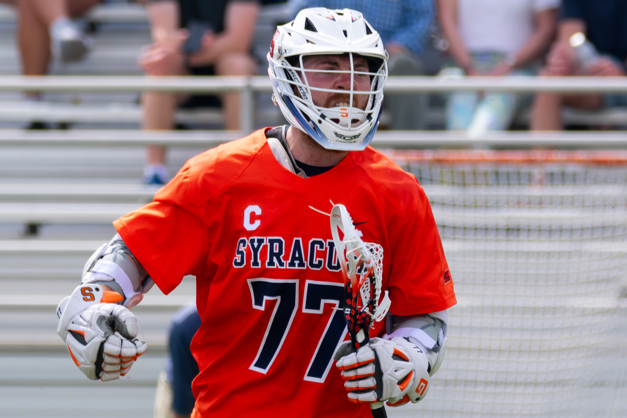 Owen Hiltz lets out a ferocious growl in celebration following his game-sealing goal with 40 seconds left in Syracuse’s win over UVA. Hiltz scored the go-ahead goal a minute and 30 seconds earlier, capping off a clutch performance in the Orange’s first ACC victory of 2025.