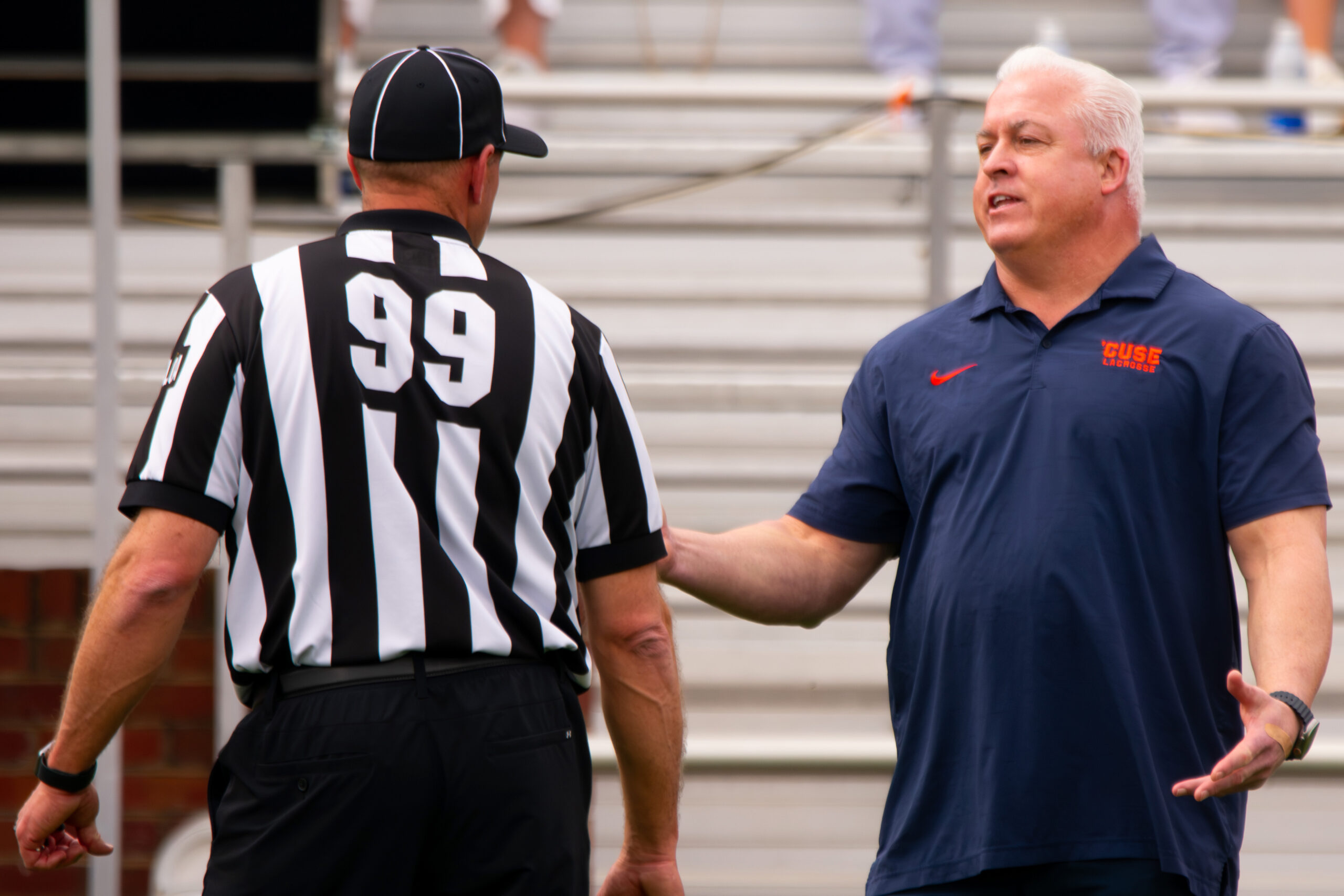 Syracuse head coach Gary Gait reasons with an official amid the Orange’s battle versus the Cavaliers. With SU’s win, Gait improved his record to 2-3 all-time when matched up against Virginia, a program led by two-time national champion head coach Lars Tiffany.