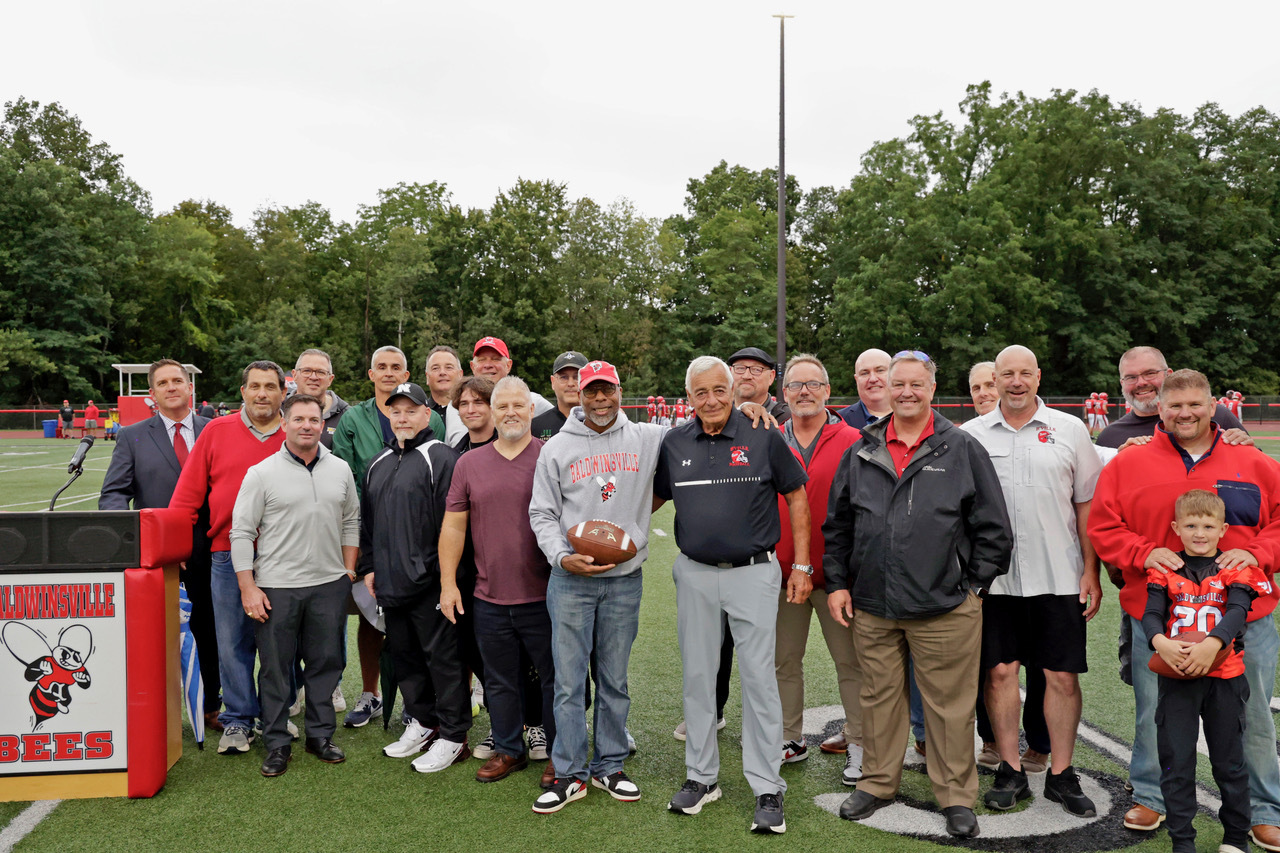 Carl Sanfilippo stands with some of his former players after Baldwinsville honored him at its football game versus West Genesee. Sanfilippo’s 40-year career with the Bees featured a regional championship in 1989. Courtesy of PJ Duffy