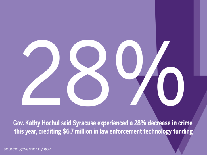 New York Gov. Kathy Hochul said crime in the city of Syracuse is down 28% from last year after a $6.7 million investment in law enforcement technology.