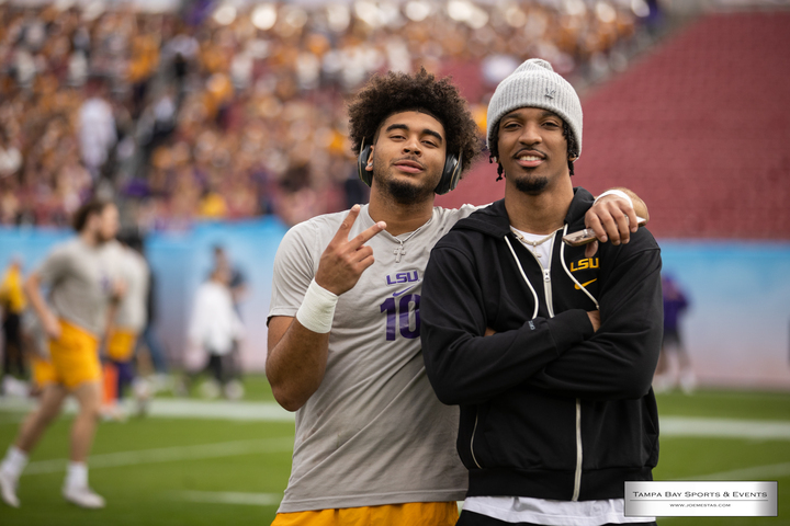 Rickie Collins (left) poses with Heisman Trophy winner Jayden Daniels (right) ahead of the 2024 Relia Quest Bowl. Daniels, in his fifth college season, became a mentor for the freshman Collins before moving on to the Washington Commanders. Courtesy of Joe Mestas