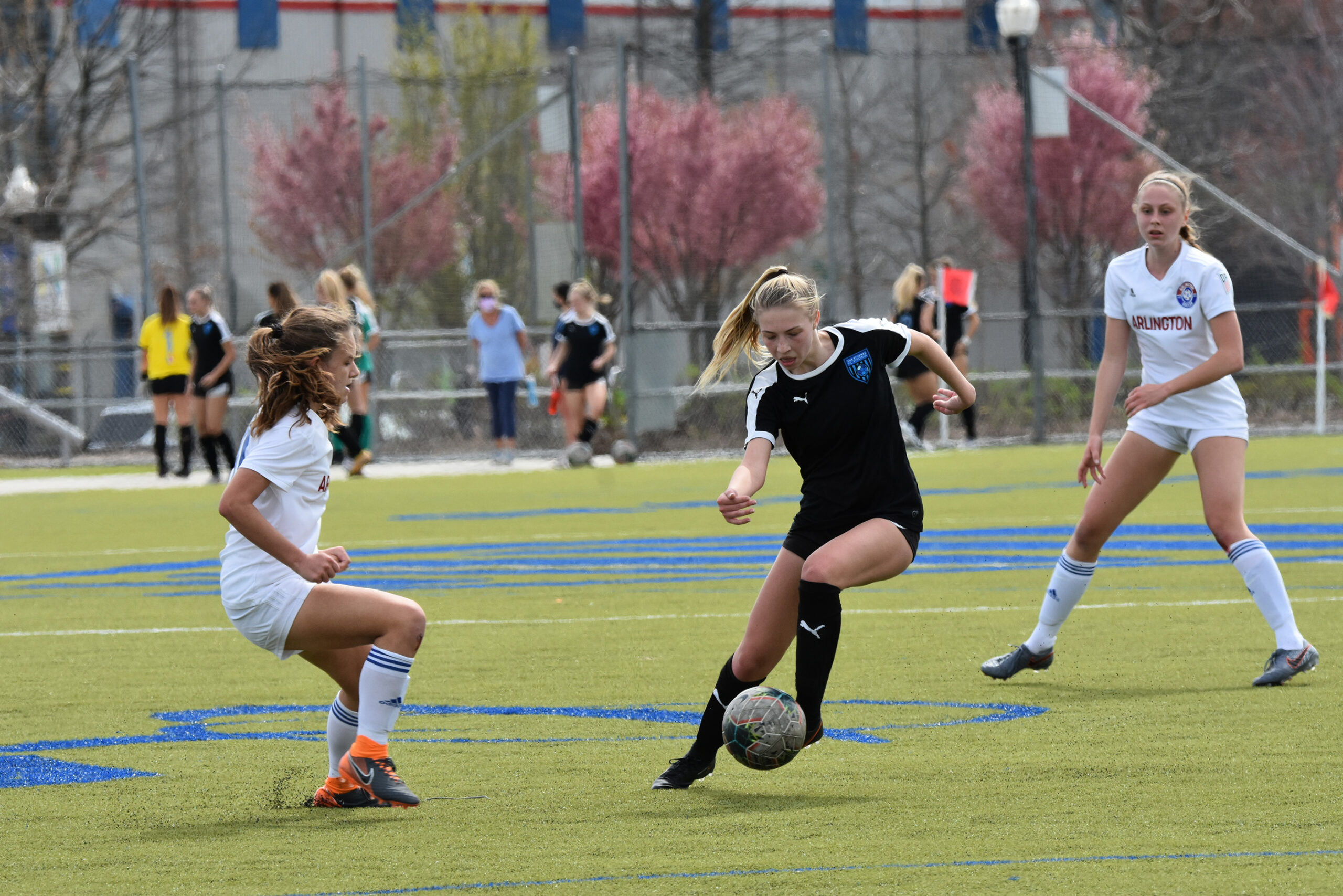 Ashley Rauch crosses past a defender while playing for FC Virginia. Rauch was one of the club’s top playmakers from age 8 through her senior year of high school. Courtesy of Stewart Rauch