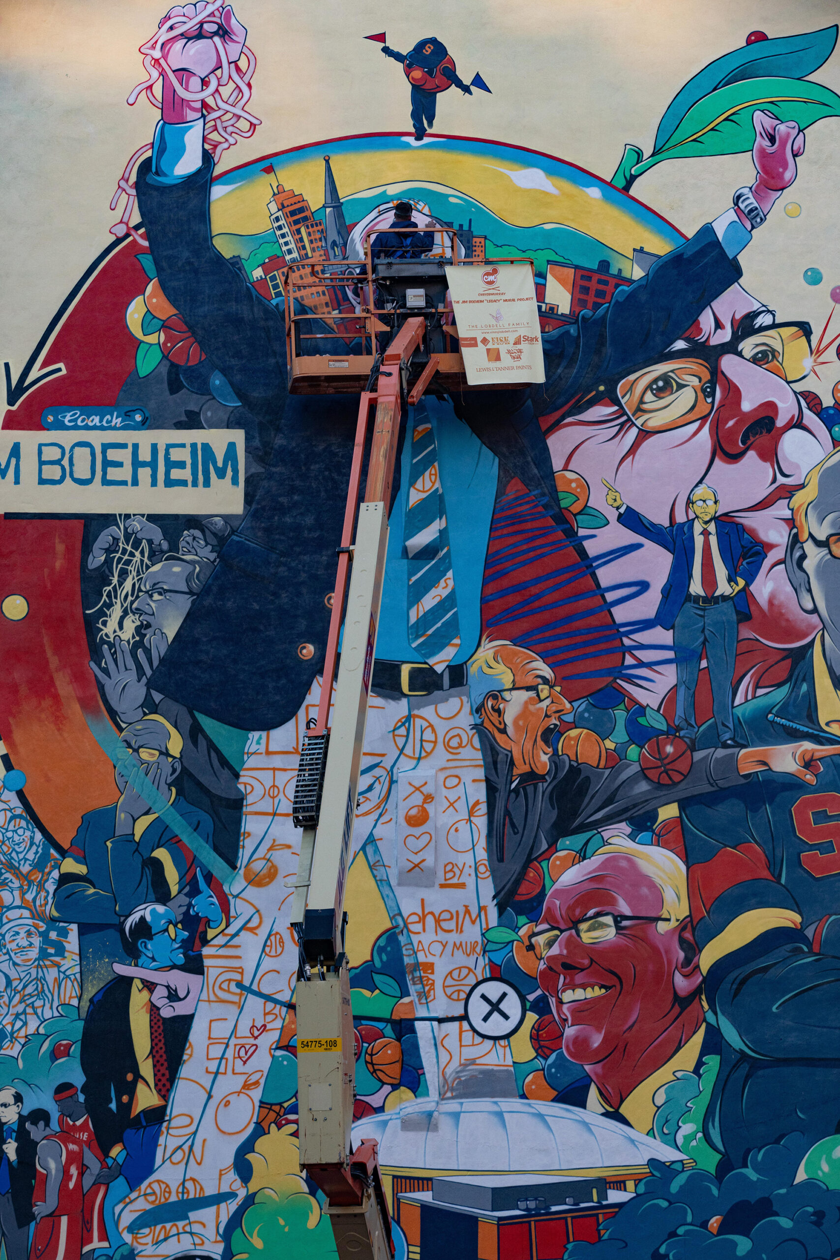 Years later, Murray’s two passions merged: he had the opportunity to paint a five-story mural of his basketball idol: Boeheim. Murray, who started painting the mural in Armory Square in September, will wrap up the mural this Friday and unveil it on Saturday.