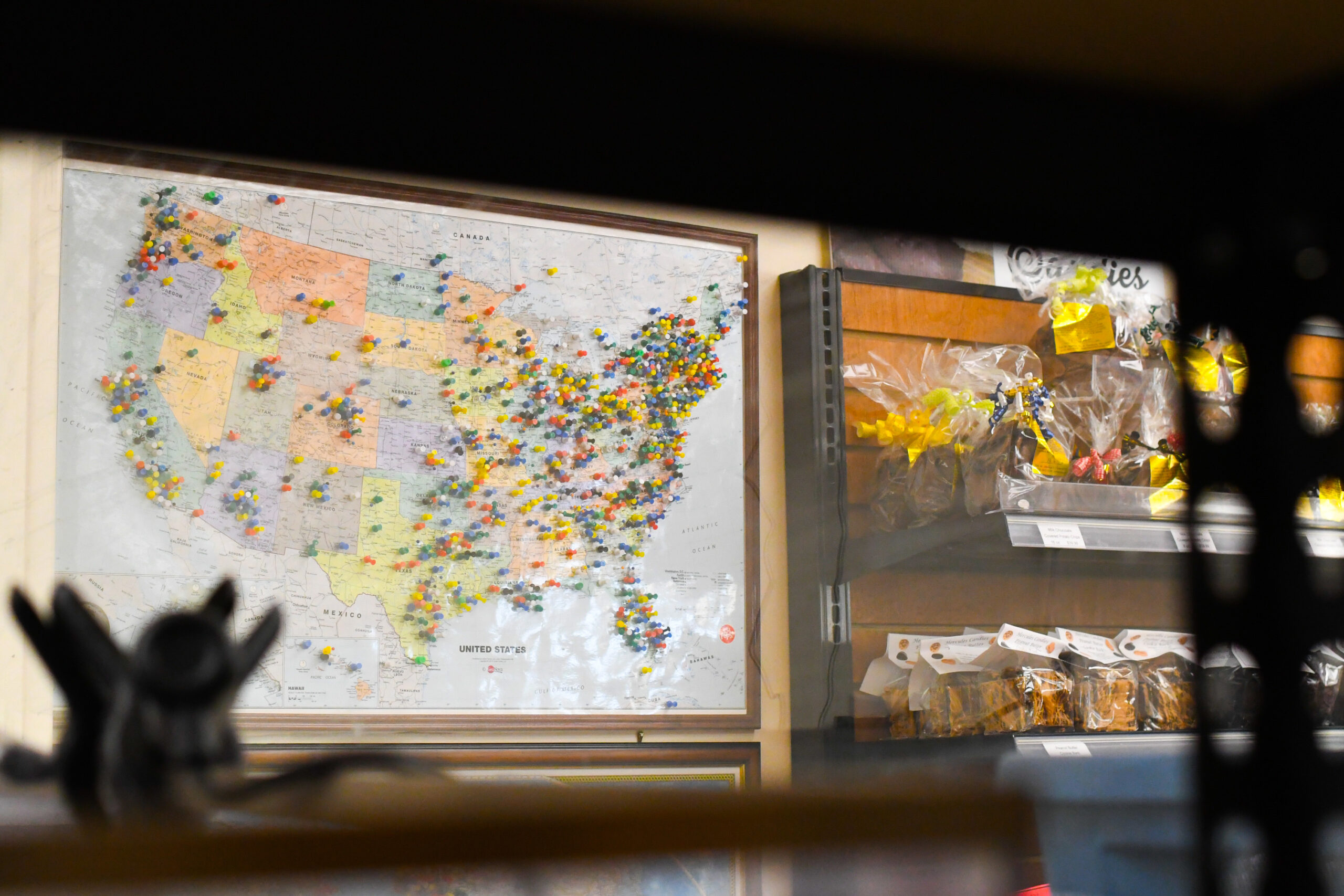 A map at the back of Hercules Candy tracks customers’ hometowns with colorful pushpins. After going viral, the shop has attracted sales from all over the country, and even internationally. Ike Wood | Asst. Photo Editor
