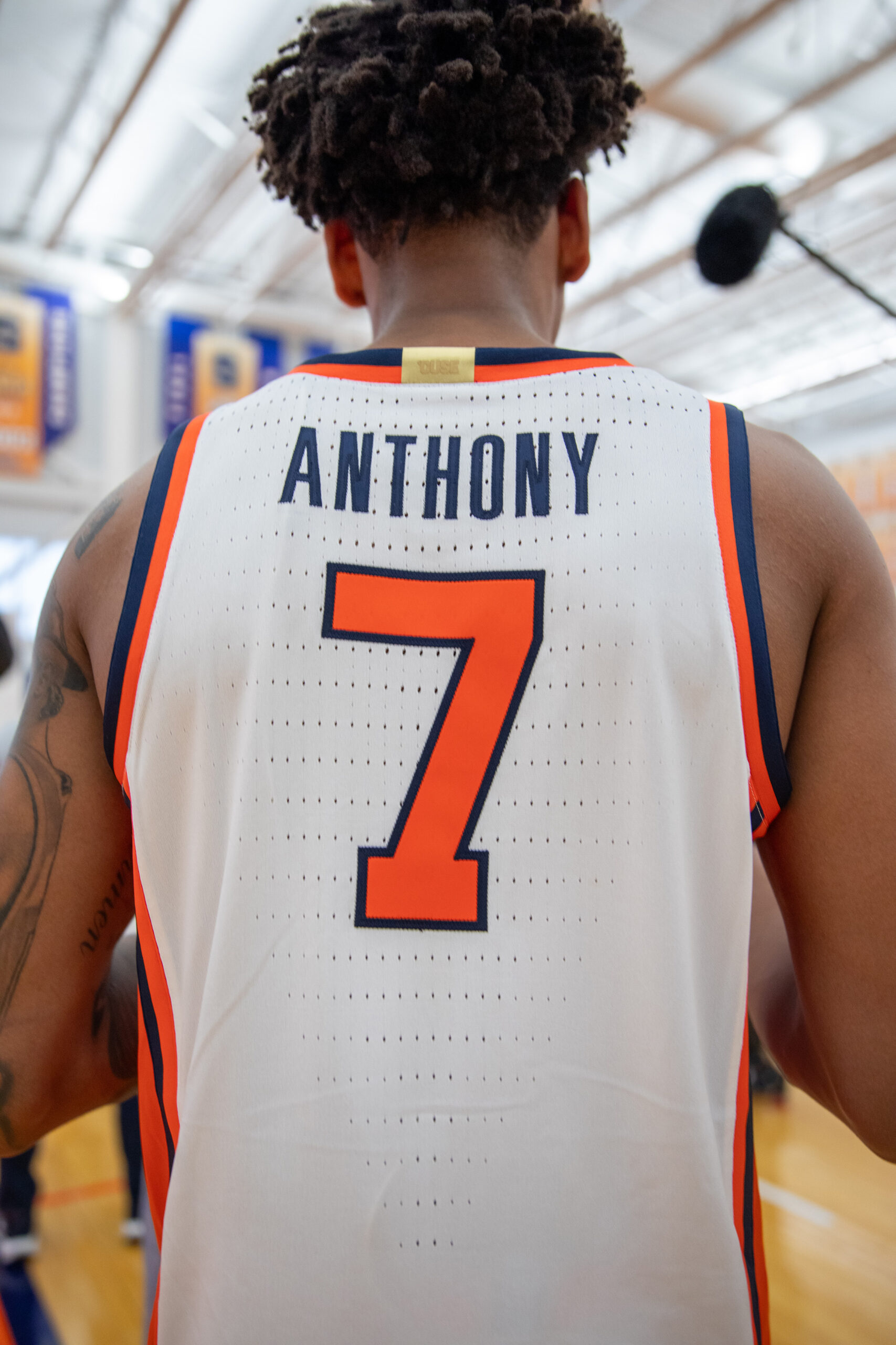 At Syracuse’s preseason Media Day, Kiyan Anthony dons his Syracuse jersey. The No. 7 is the same number Carmelo wore for most of his time in the NBA. Leonardo Eriman | Photo Editor