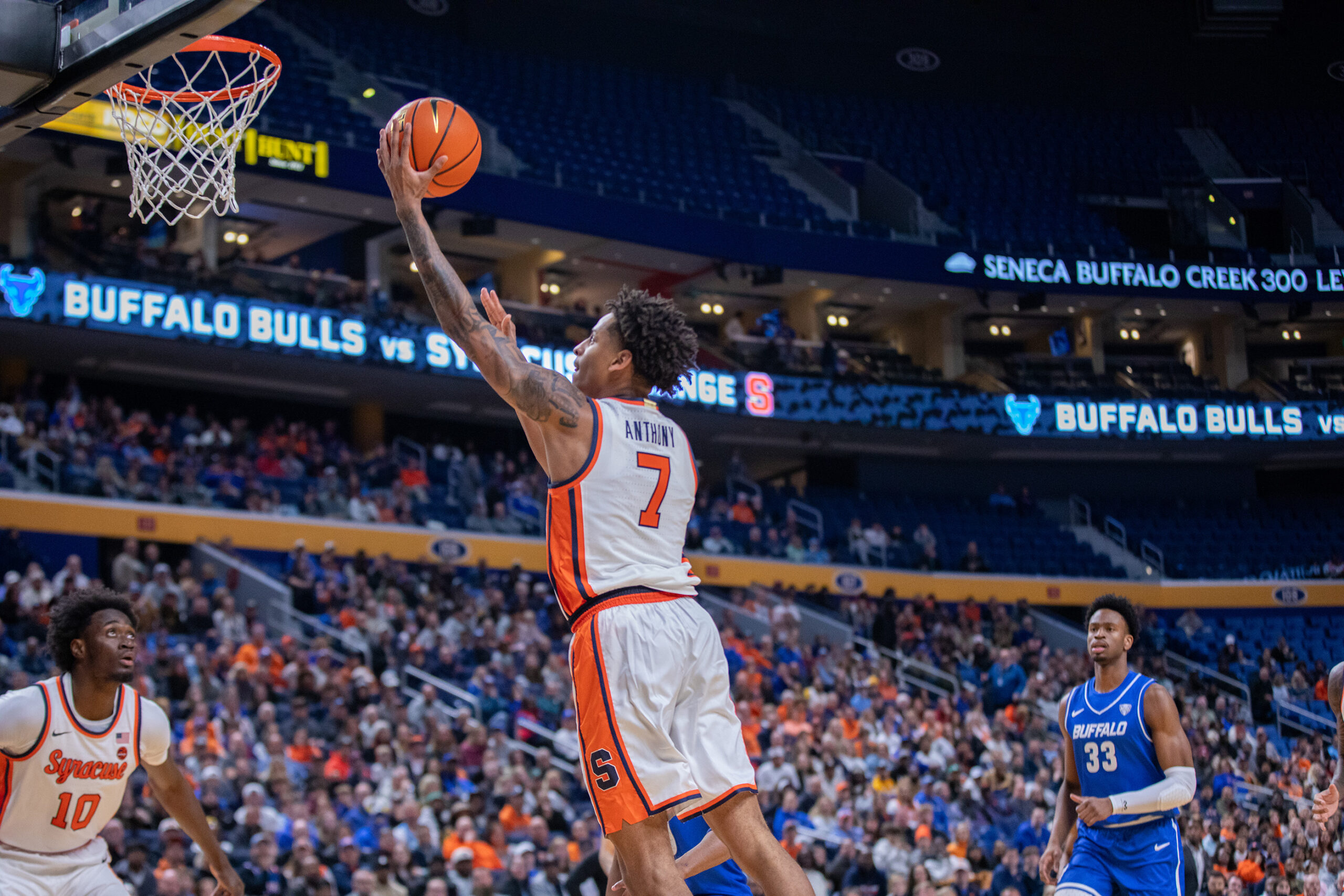 In Syracuse’s season-opening exhibition game against Buffalo, Kiyan Anthony sinks a layup. In his first unofficial college action, he finished with 10 points and hit two 3s. Leonardo Eriman | Photo Editor