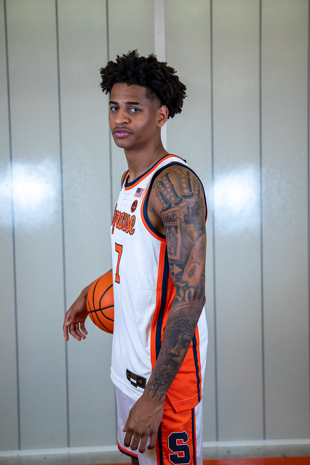 Kiyan Anthony shows off his tattoo sleeve at SU’s Media Day. The piece mirrors his father’s photo holding a newspaper after he won the 2003 national title. Leonardo Eriman | Photo Editor
