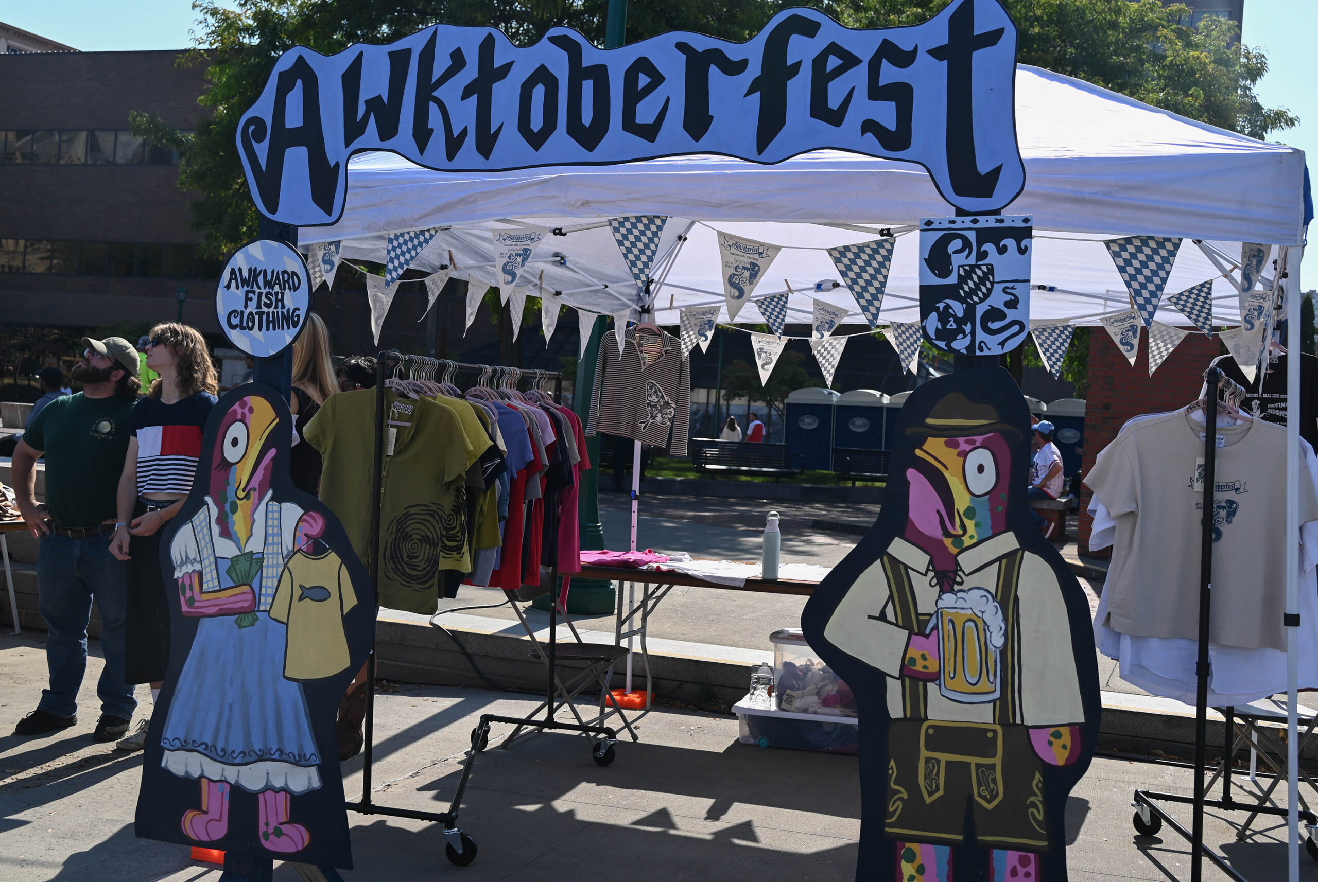 Syracuse University student Holly Anderson sells her brand Awkward Fish’s clothing at Oktoberfest. Other vendors sold clothing featuring Oktoberfest-related designs. Kai Pavlova | Contributing Photographer