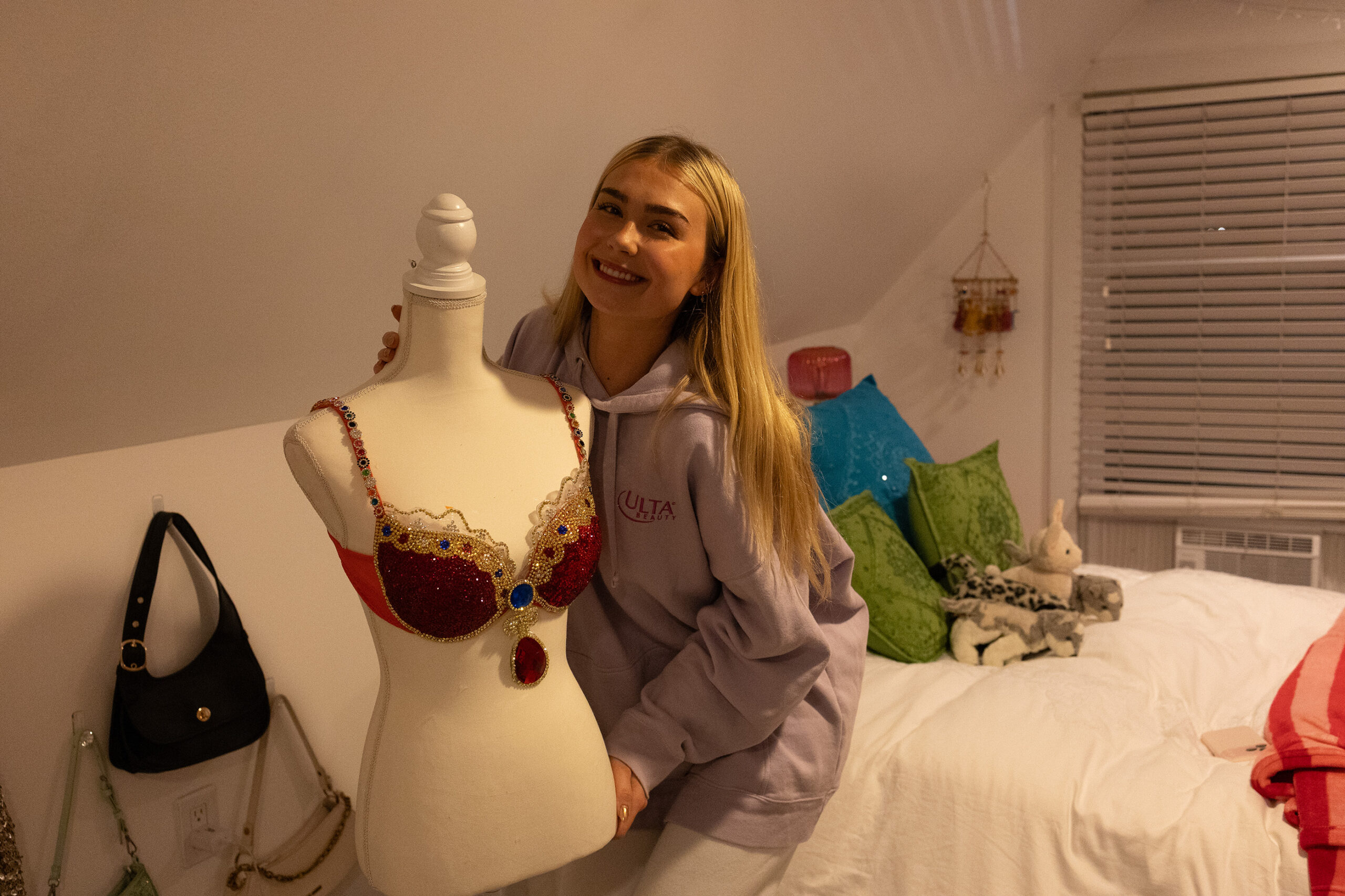One of Marissa Hoinowski’s handmade costumes this year is Victoria Secret angel Candice Swanepoel’s fantasy bra. She works on the costume on a mannequin in her room.Dana Kim | Staff Photographer