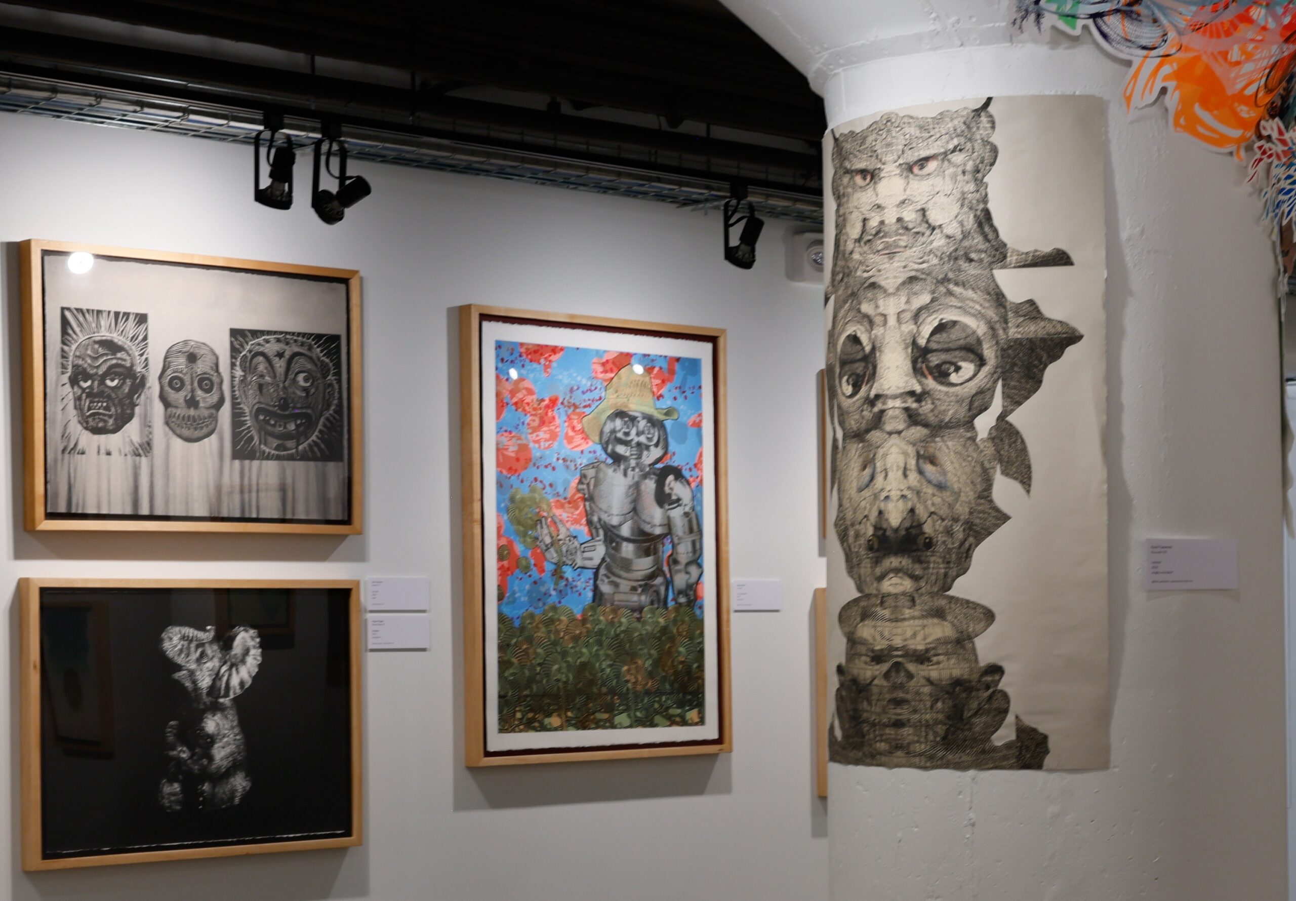 Printing blocks, masonite carvings and plates line the walls of the Nancy Cantor Warehouse Gallery. Some prints depict experimental techniques, while others are of nature, like wolves, showing two decades of work and collaboration from visiting artists.