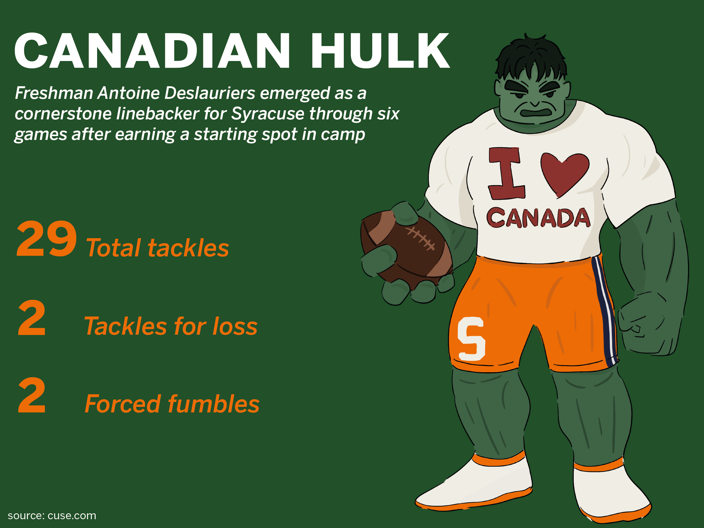 Not Deslauriers. The Montréal, Quebec native said he bulked up through constant training sessions with Miron and a strict eating schedule during high school. His consistency in the gym and instincts as a linebacker made him a sought-after three-star recruit, earning numerous Power Four offers. He chose SU, and in his first season, Deslauriers has emerged as a bright spot on a porous defense.