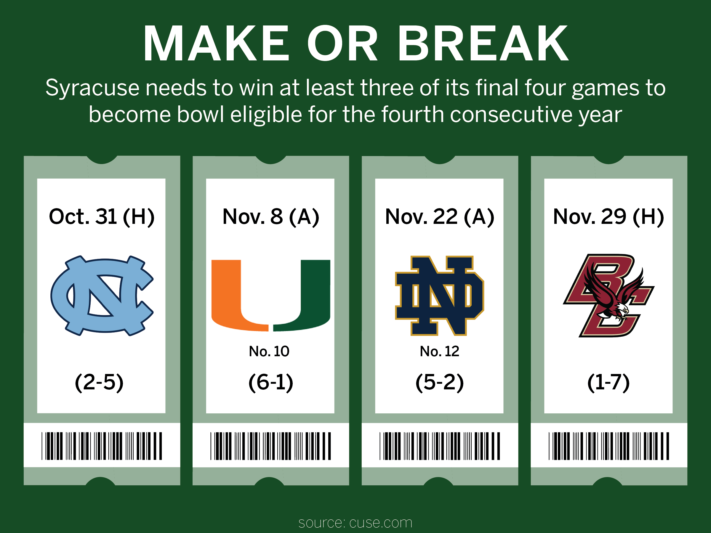 Syracuse’s chances of making a bowl game are slim. Its recent skid is to blame, but also the daunting schedule ahead. The Orange still have trips to No. 10 Miami and No. 12 Notre Dame, both of whom are vying for College Football Playoff berths.