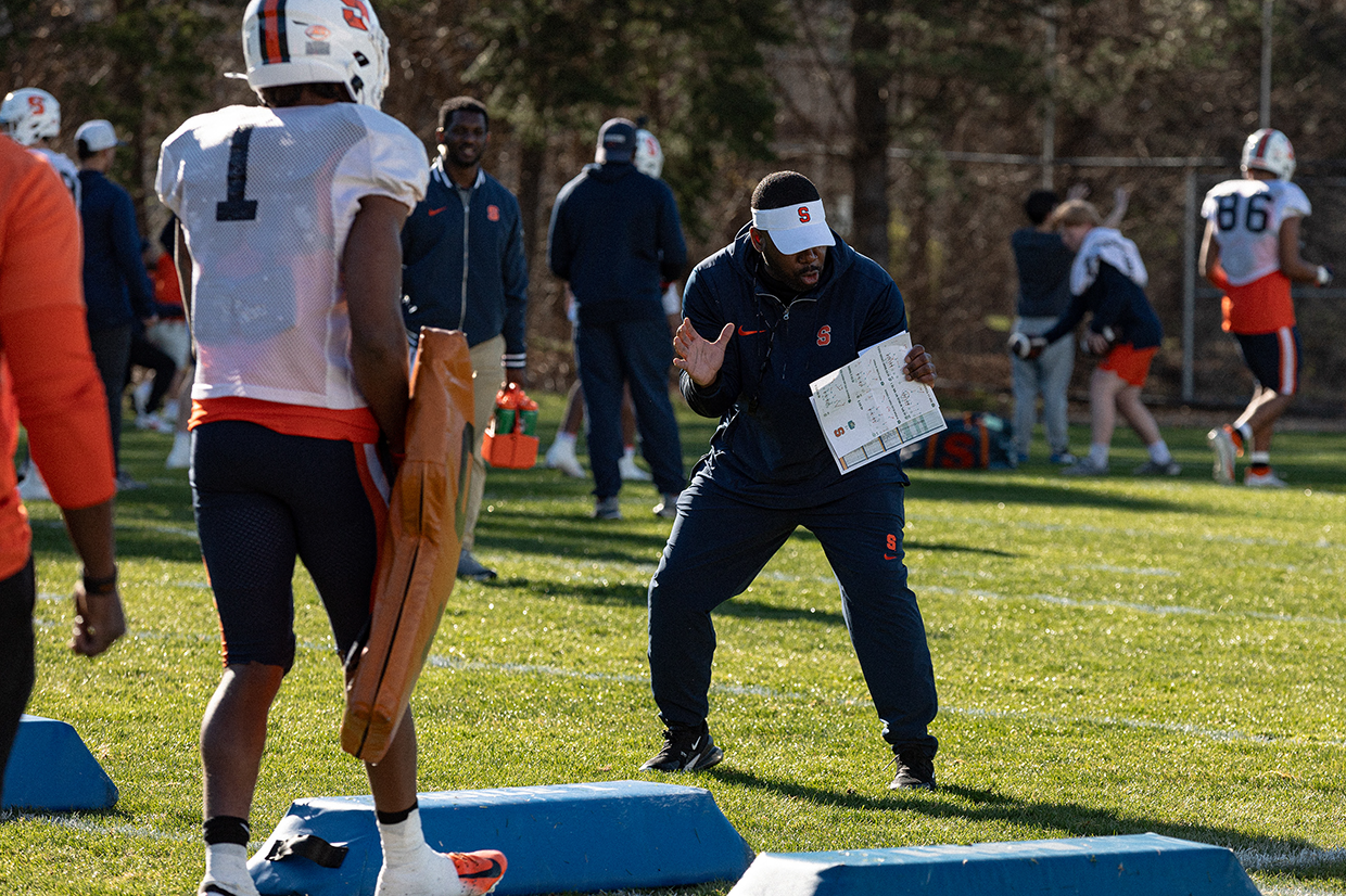 Jeff Nixon barks out instructions to a Syracuse player during its spring camp in 2024. Nixon has helmed the Orange to 13 wins over his first two seasons with the program. Joe Zhao | Senior Staff Photographer
