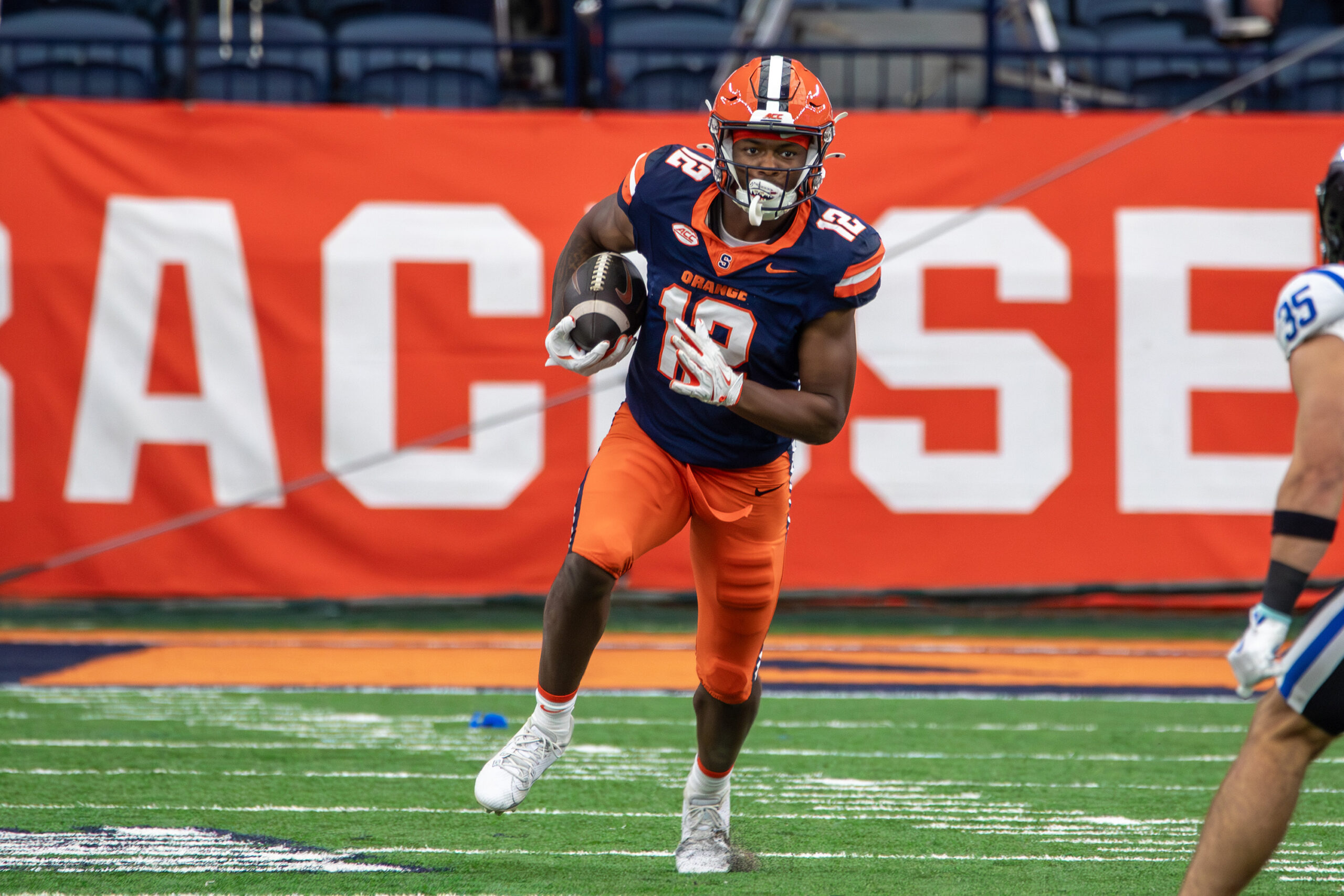 Justus Ross-Simmons sprints upfield in Syracuse’s loss to Duke on Sept. 27. After a slow 2024 campaign with the Orange, Ross-Simmons has exploded for five touchdowns so far this season. Leonardo Eriman | Photo Editor