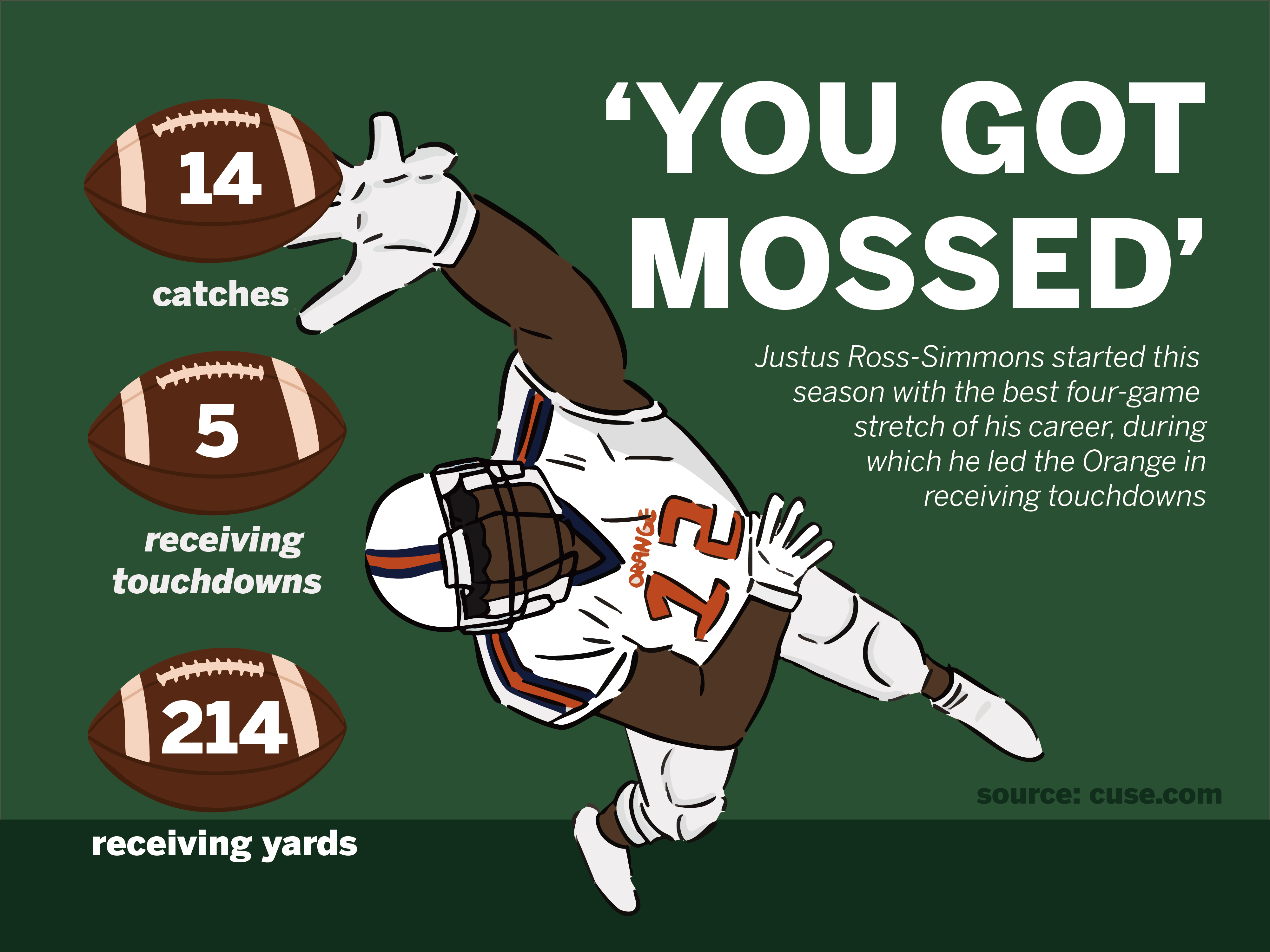 The 12-yard receiving score was featured on ESPN’s “You Got Mossed” segment that Sunday, where Hall of Fame receiver Randy Moss picks the best catches of the week, specifically where you “Moss” an opposing defender — essentially catching a ball over their head. It’s high praise. And both Ross-Simmons and fellow Syracuse receiver Darrell Gill Jr. have been on “You Got Mossed” this season.
