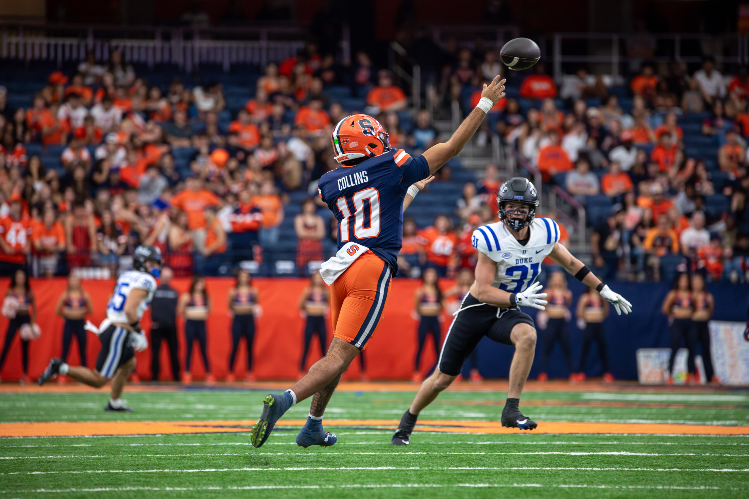 Rickie Collins releases a pass to the right side of the field in Syracuse’s loss to Duke. Collins struggled in his first career start against the Blue Devils, tossing zero touchdowns and throwing one interception. Leonardo Eriman | Photo Editor