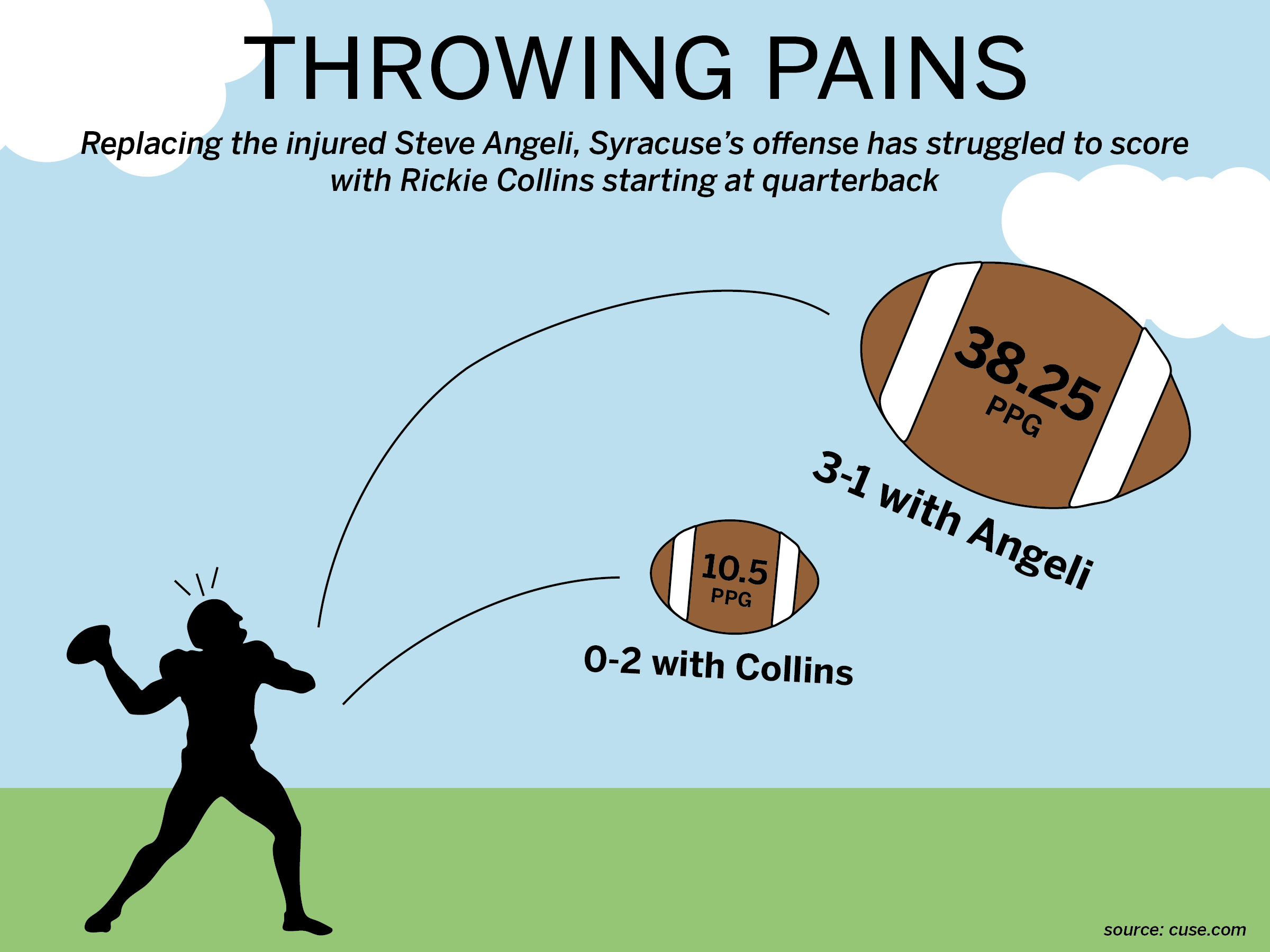 Offensive coordinator Jeff Nixon’s unit averaged 38 points per game in four games started by Angeli, who led the FBS in passing yards (1,317) before his injury. With Collins starting, the Orange are averaging 10.5 points.