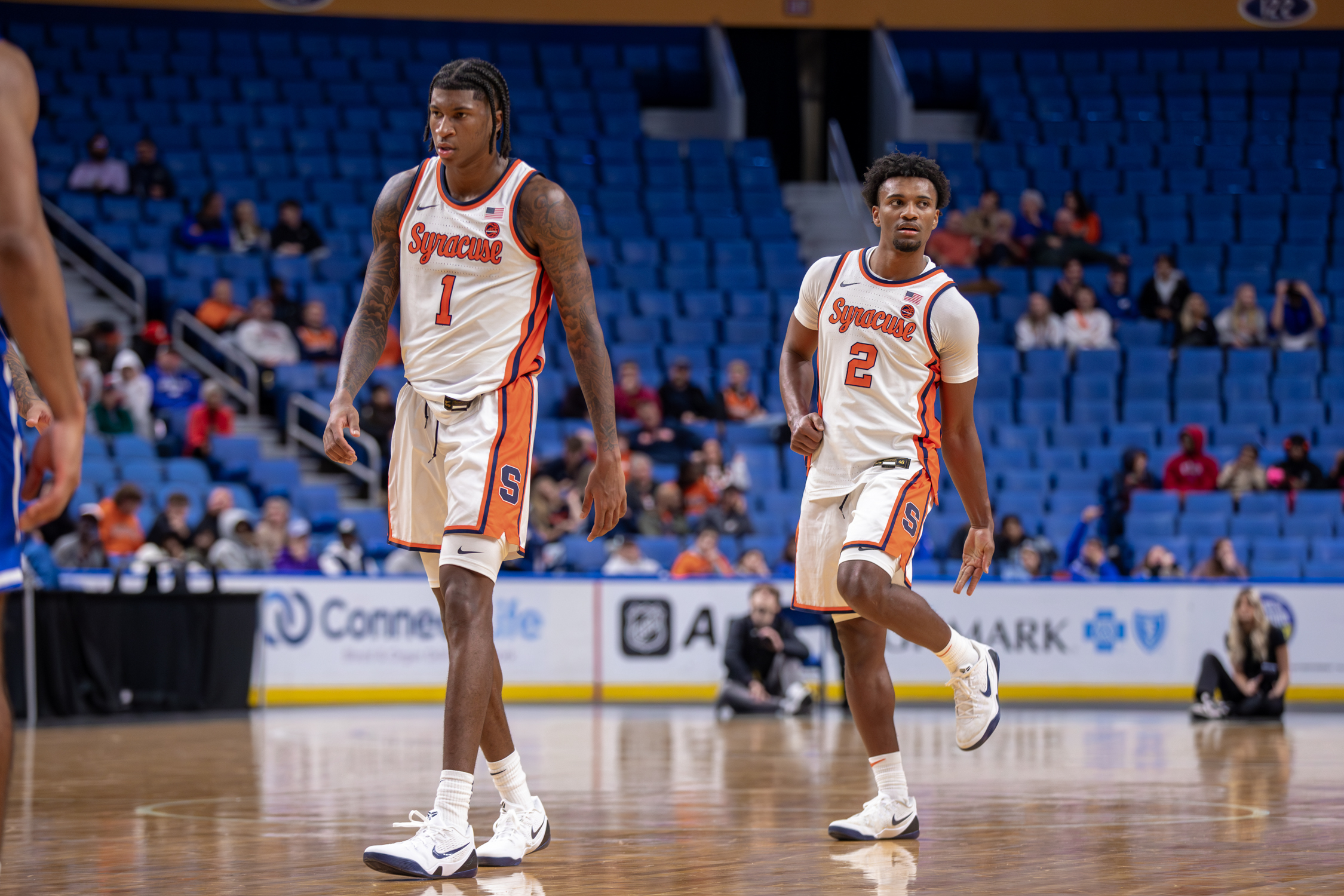 Donnie Freeman and J.J. Starling walk toward the free throw line in Syracuse’s exhibition versus Buffalo. Both Freeman and Starling scored over 13 points per game last season but return to SU due to injury-riddled campaigns. Leonardo Eriman | Photo Editor
