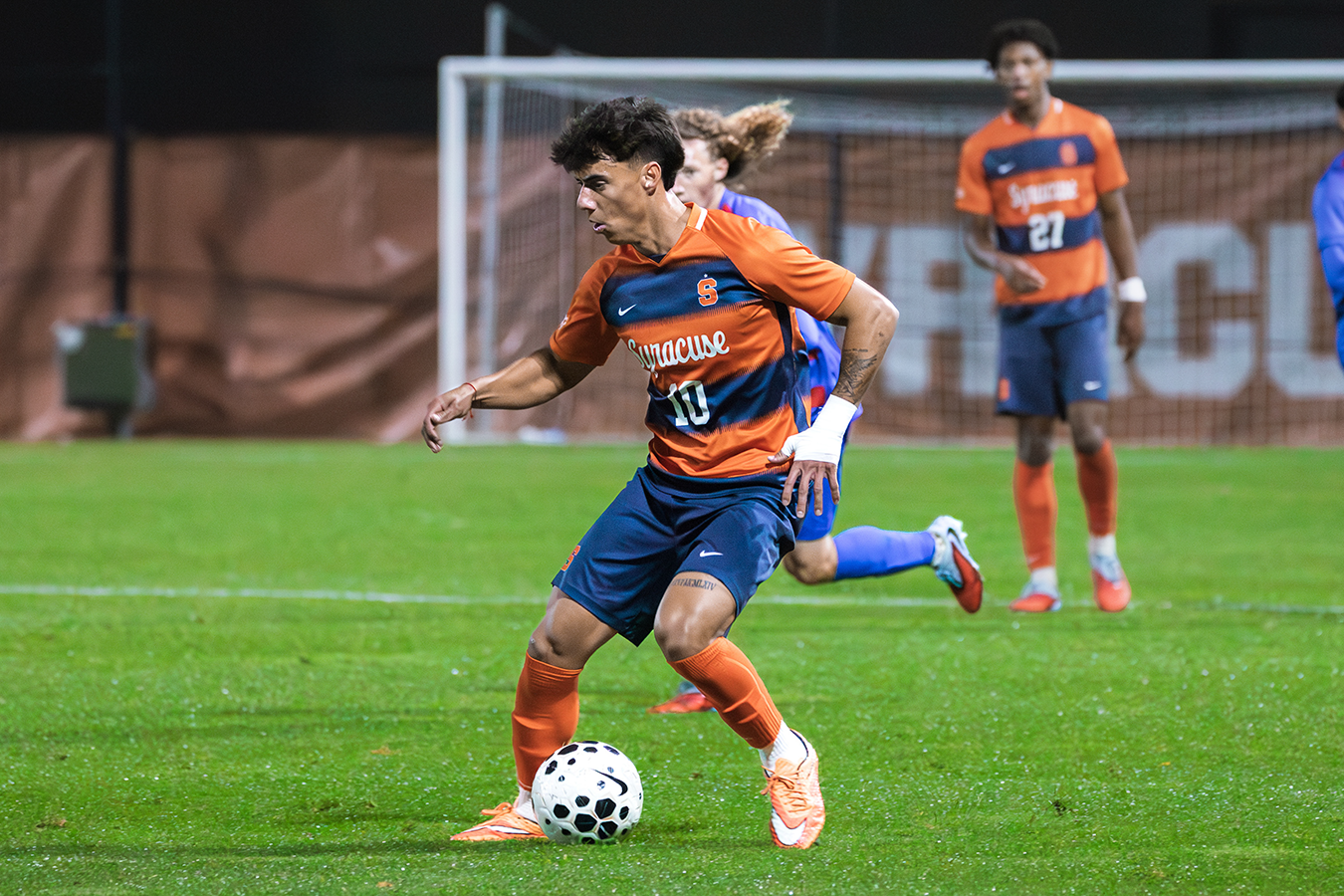 During SU’s game against then-No. 25 SMU, Carlos Zambrano scans the field in front of him. Zambrano’s second-half goal against the Mustangs padded the Orange’s lead in their eventual 2-0 win. Leonardo Eriman | Photo Editor