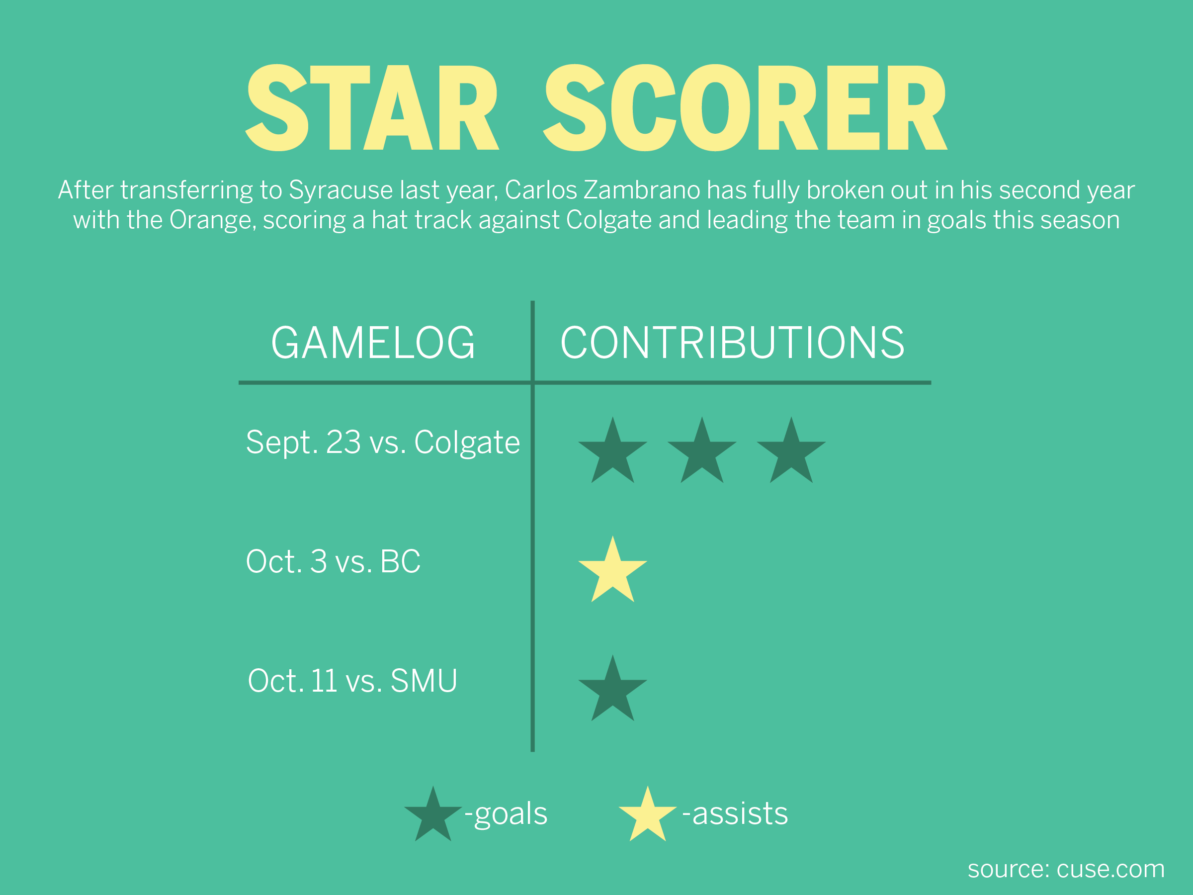 Although he played sparingly, the Green helped mold Zambrano into a dynamic midfielder for the Orange as a senior. Through 13 games, his four goals and nine points both lead the Orange — highlighted by his hat trick against Colgate on Sept. 23.