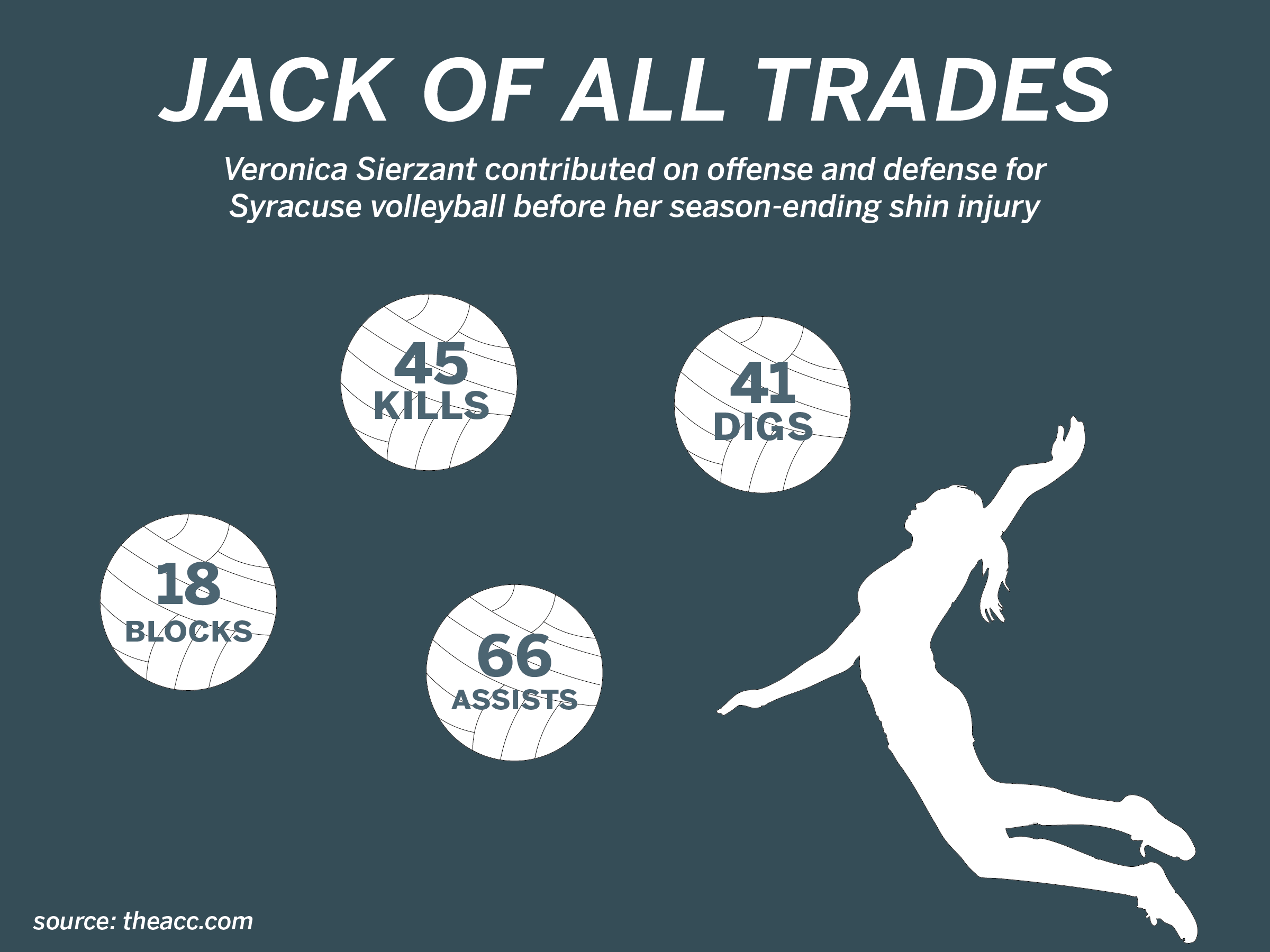 That all changed in SU’s matchup with then-No. 6 Louisville on Sept. 28. Sierzant exited in the first set and was ruled out for the season with a shin fracture.