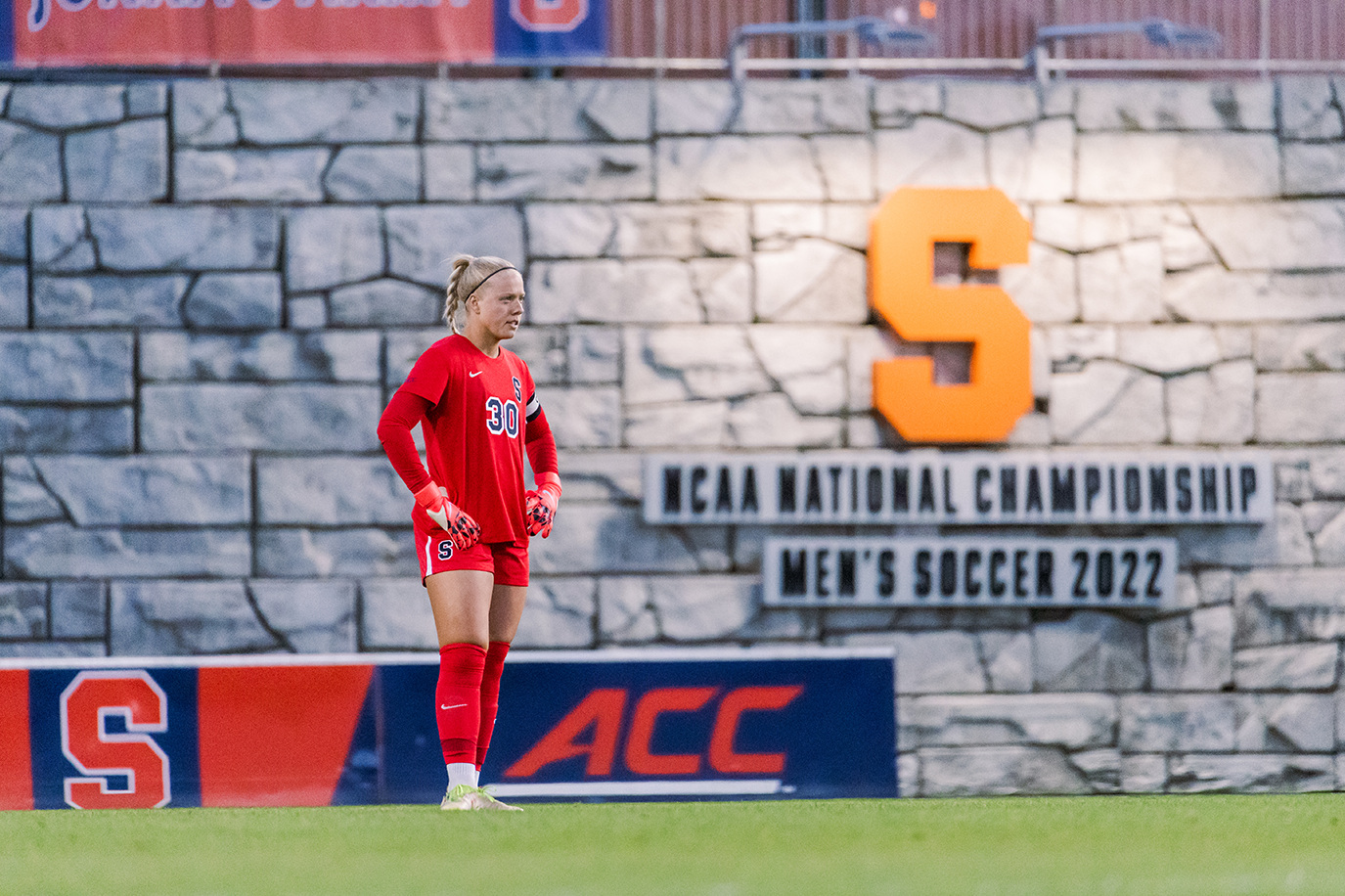 Shea Vanderbosch stands alone during SU’s battle with No. 1 Virginia. This season, Vanderbosch has amassed 62 saves, pushing her above Courtney Brosnan on SU’s all-time saves list. Aaron Hammer | Staff Photographer