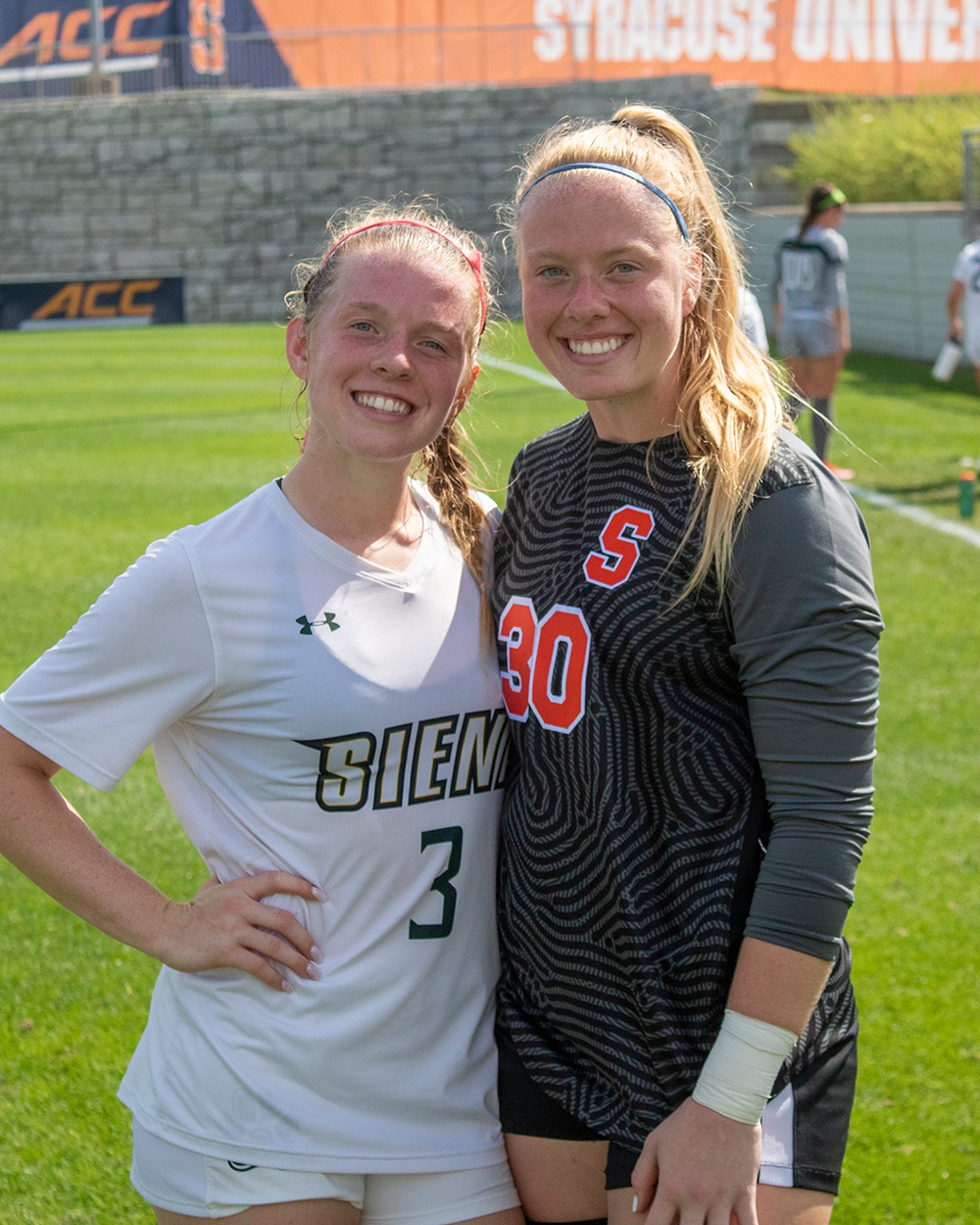 Kam and Shea Vanderbosch pose on the field at SU Soccer Stadium after Syracuse played Siena in 2022. The twins considered attending the same school, but Shea’s dream to become a professional soccer player led her to SU. Courtesy of Pam Vanderbosch