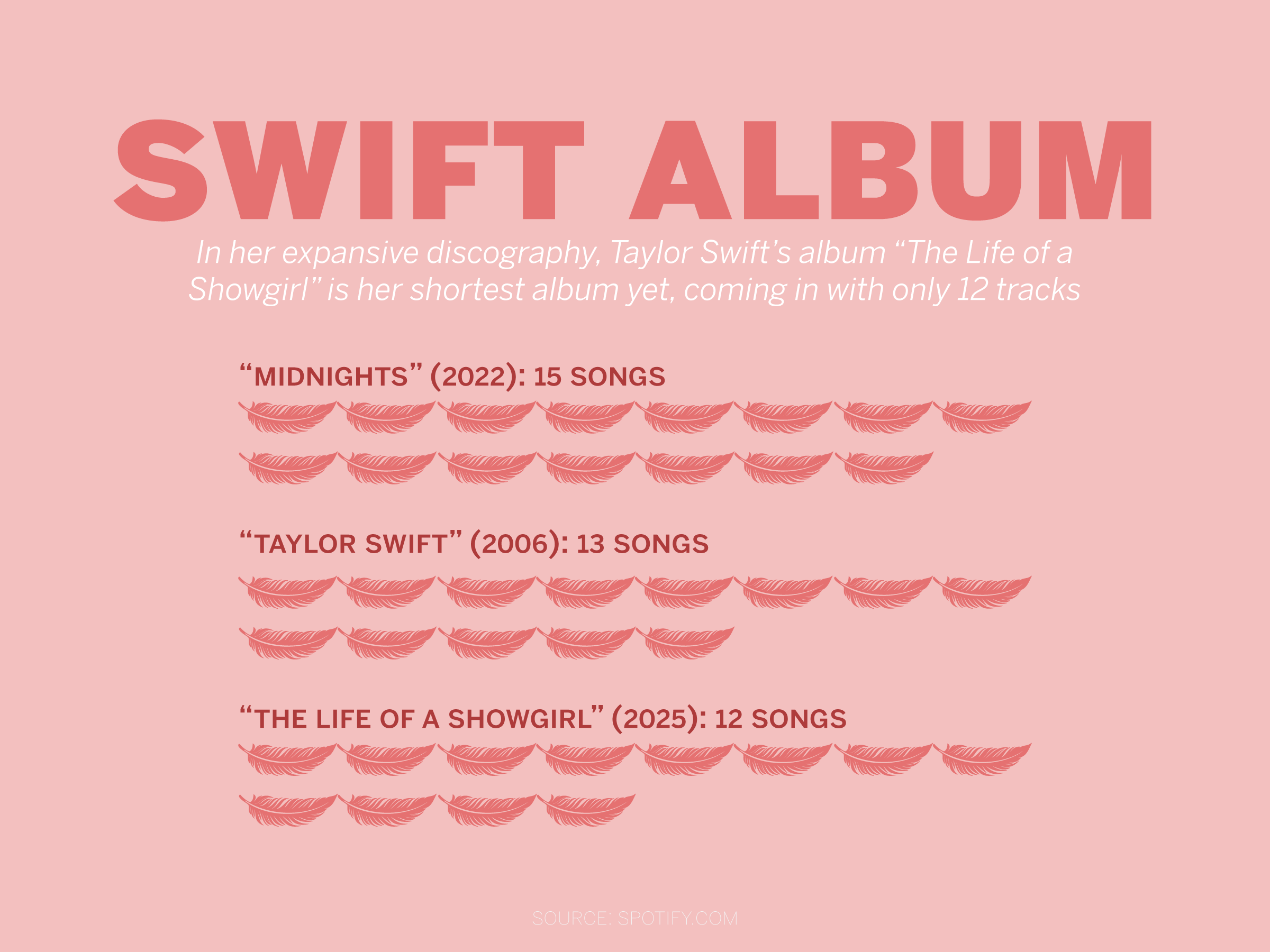 “The Life of a Showgirl” includes only 12 tracks, a sharp contrast from Swift’s last drop, a double album. From beginning to end, the album goes behind the scenes on Swift’s experience on the Eras Tour. Kendall Thompson | Contributing Illustrator