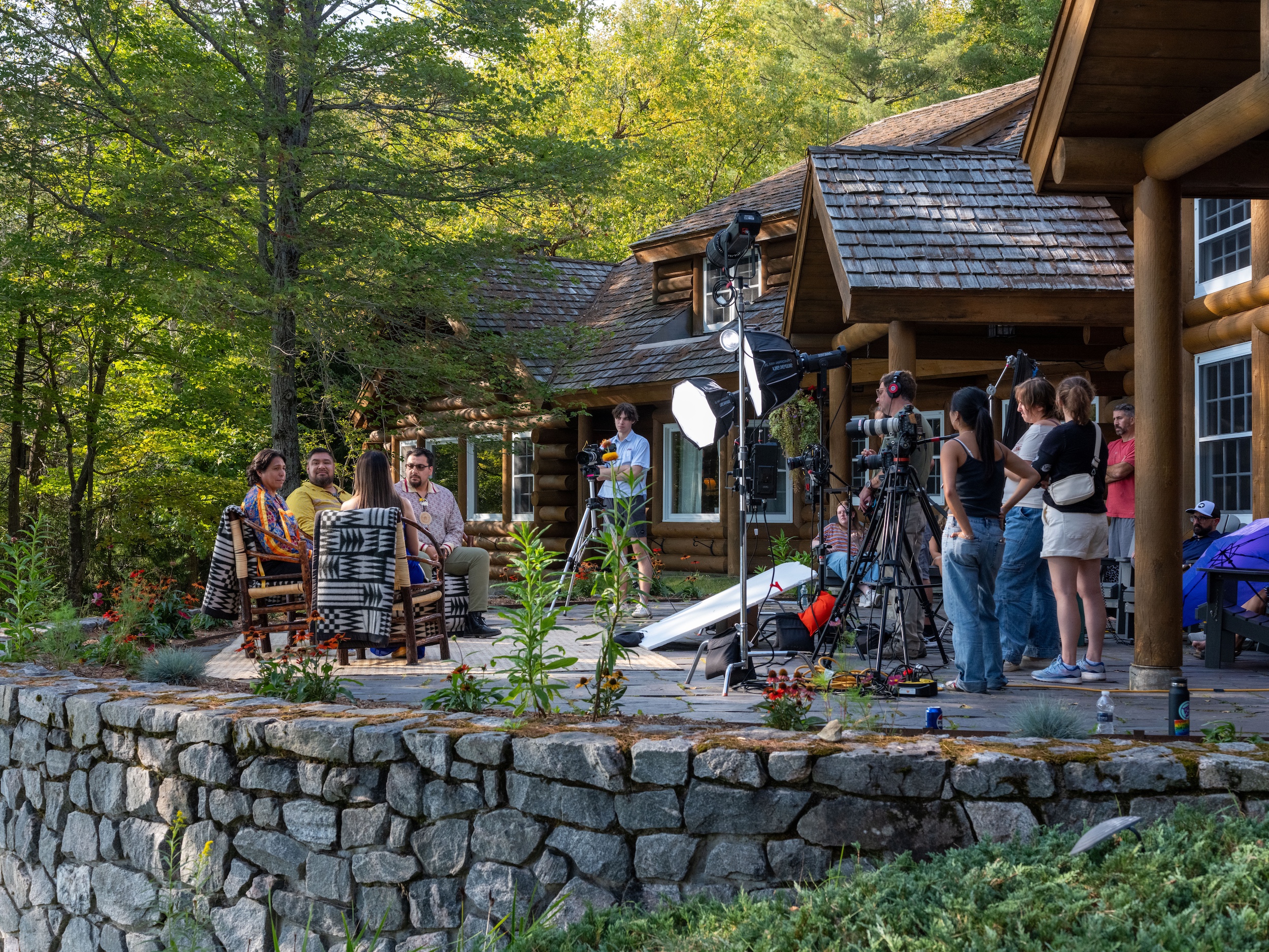 The Rematriation team gathered in mid-September 2024 to film the talk show on Blue Mountain Lake at SU’s Minnowbrook Conference Center. Collaborators from the College of Visual and Performing Arts, the Newhouse School of Public Communications and Orange Television Network, members of SU Libraries’ Sound Beat: Access Audio team and Haudenosaunee consultants joined the team, along with 10 Newhouse students.