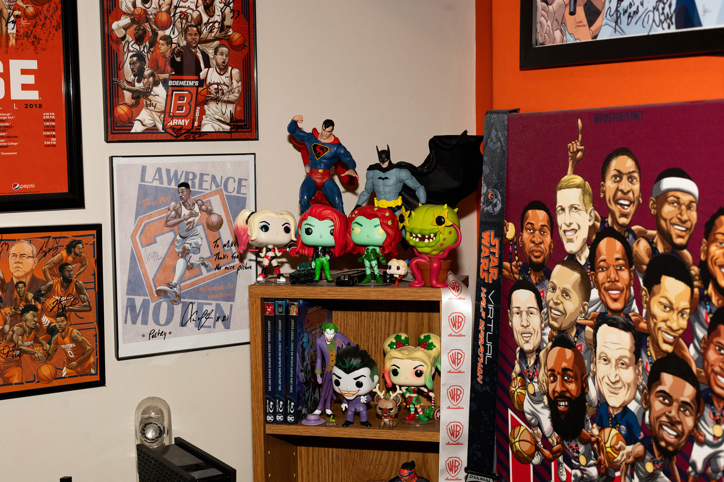 Hand-drawn posters of SU sports teams, including men’s and women’s basketball and women’s lacrosse, are spread throughout Borkowski’s office. A signed drawing of Syracuse men’s basketball legend Lawrence Moten sits next to a piece of the 2018 Boeheim’s Army squad in the right corner. On the right wall is a framed special-edition Defenders of the Diamond Syracuse Mets jersey, which Borkowski helped design.