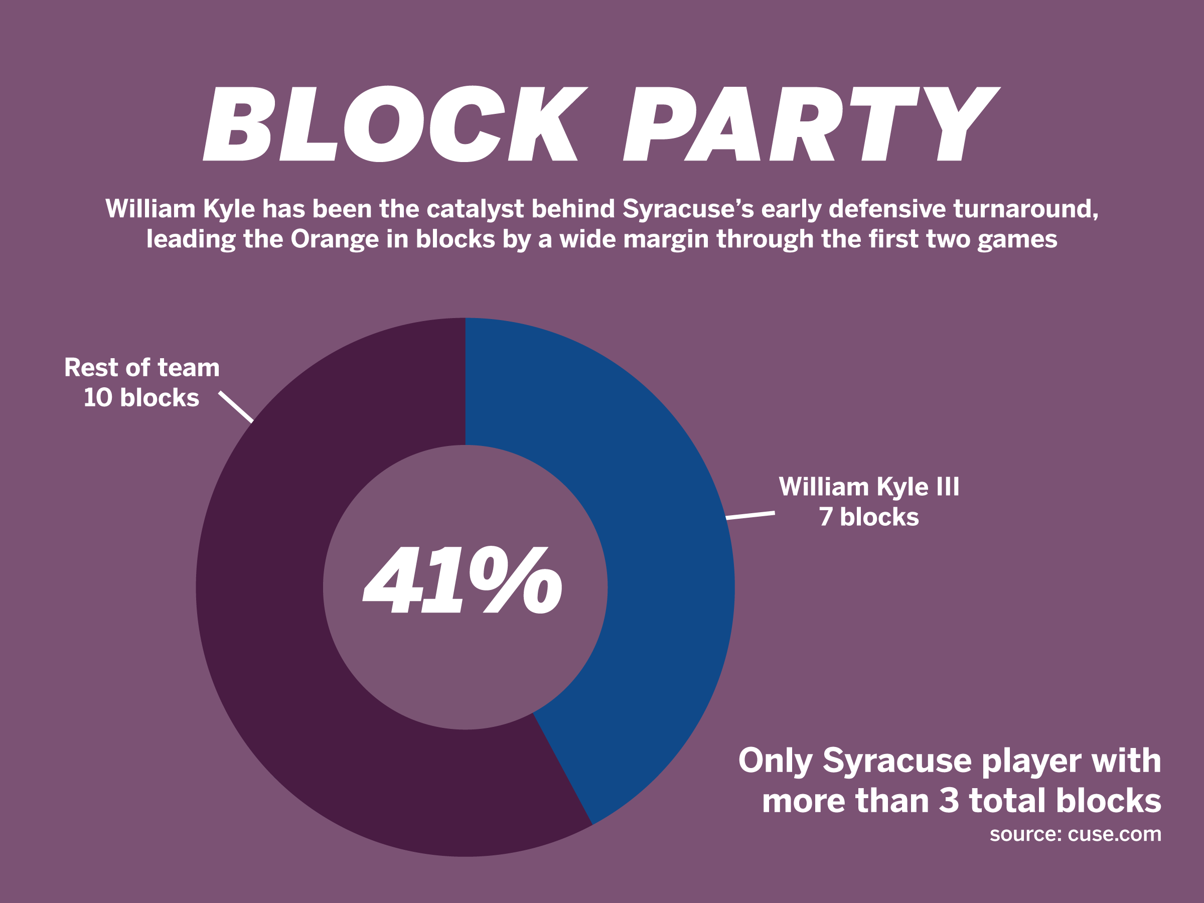 With Freeman sidelined, Eddie Lampkin Jr. and Jyare Davis became SU’s top inside defenders a year ago. Yet Lampkin Jr. only recorded 16 blocks all season, while Davis tied with 6-foot-7 forward Chris Bell at 13. Kyle is listed at just 6-foot-9. But he’s playing far bigger thus far.