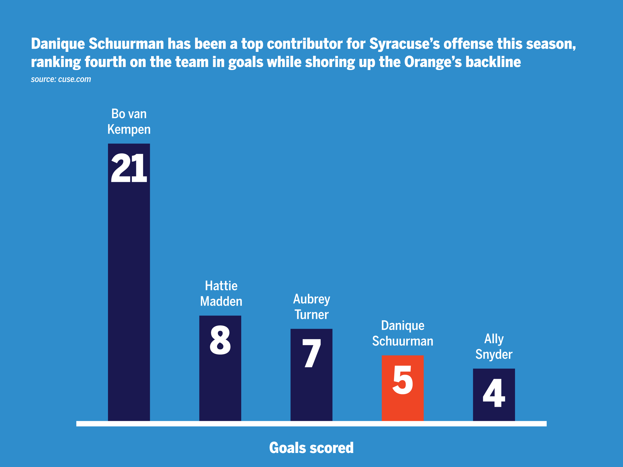 That freedom, van de Rakt said, has carried over to Schuurman’s time in the U.S.. It’s allowed Schuurman to step up in big moments at SU, as two of her goals have been game-winners. When she returns to the Netherlands, van de Rakt said he hopes Schuurman plays with a similar edge.