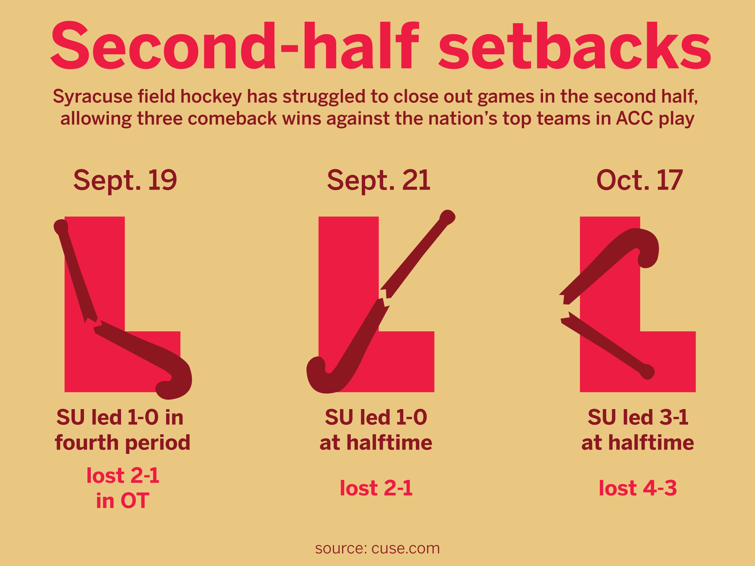 Against then-No. 3 Virginia two days later, Syracuse held a 1-0 lead at halftime, outshooting the Cavaliers 8-0. Yet, in eerily similar fashion to its loss to Wake Forest, Mia Abello’s last-minute penalty stroke goal doomed SU, resulting in a 2-1 defeat.