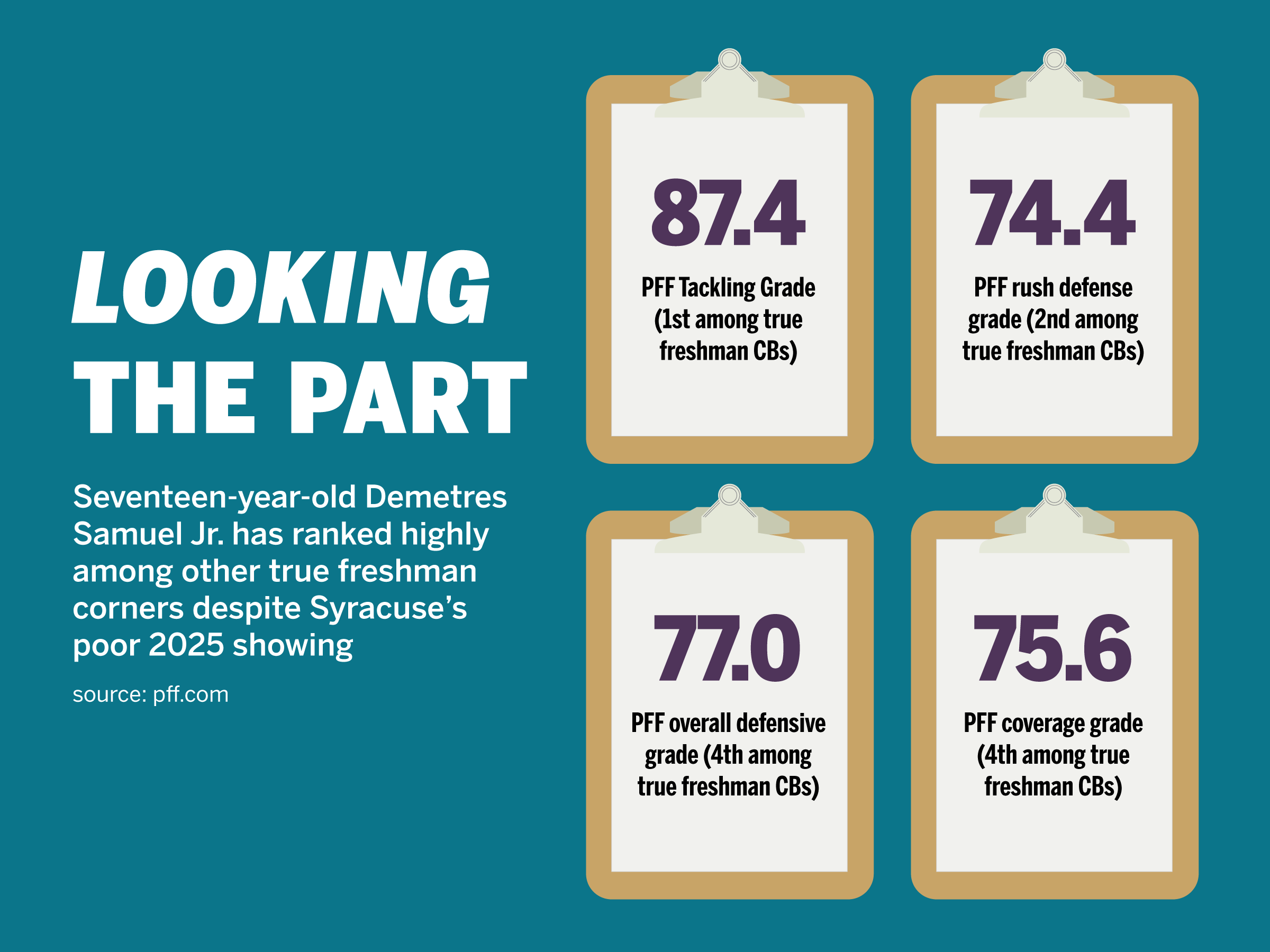 Samuel may be 17, yet in his true freshman season, he’s established himself as a cornerback that offenses would be wise to avoid. Opponents quickly got the memo. He hasn’t faced more than four targets since Oct. 4 against SMU. Over his first 10 career games with Syracuse, Samuel ranks first among all true freshmen with eight pass breakups and boasts a 76.5 coverage grade, per Pro Football Focus, the seventh-best mark of freshmen corners.