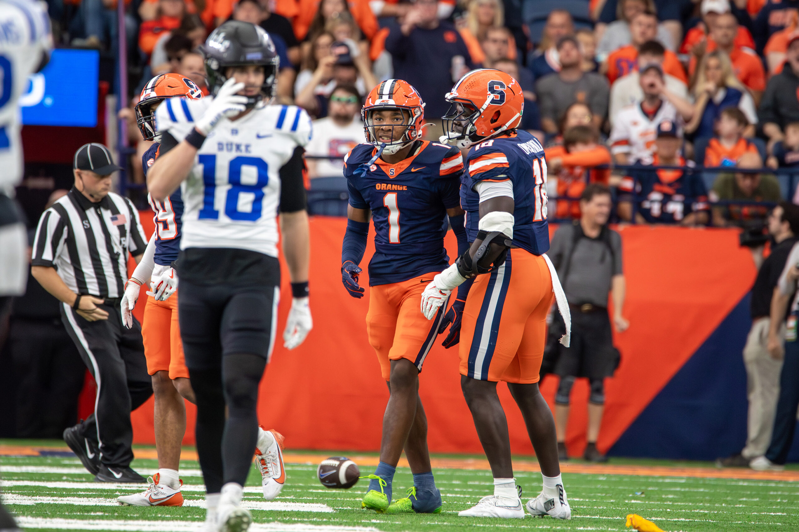 Demetres Samuel Jr. confers with teammate David Omopariola during Syracuse’s 38-3 loss to Duke on Sep. 27. Since his rough debut against Tennessee, Samuel has accrued one interception and seven pass breakups. Leonardo Eriman | Photo Editor