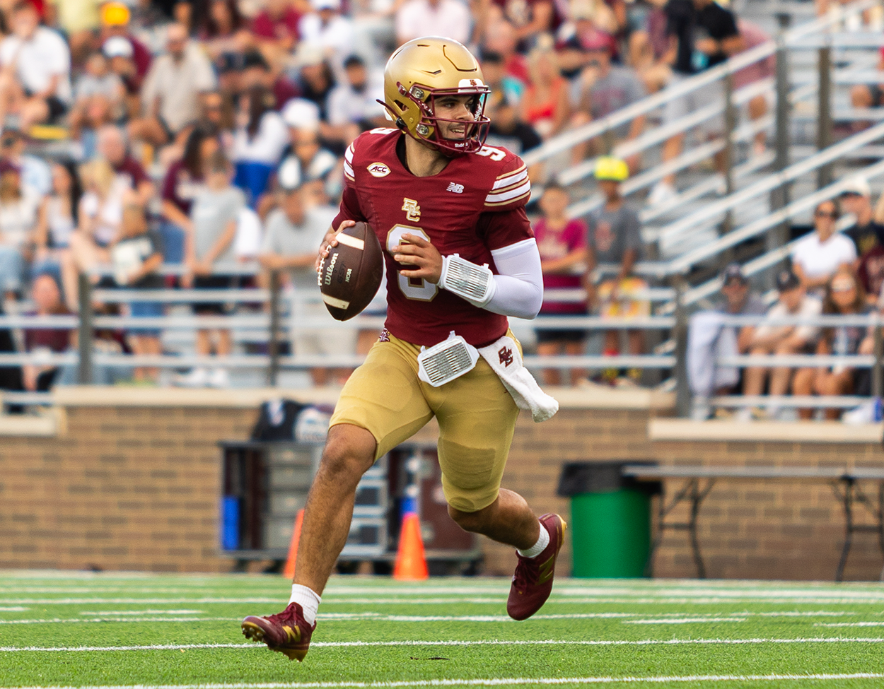 Dylan Lonergan escapes the pocket in Boston College’s season opener against Fordham. After playing in just three games at Alabama, Lonergan has worked through some bumps in his first season at BC. Courtesy of Boston College Athletics