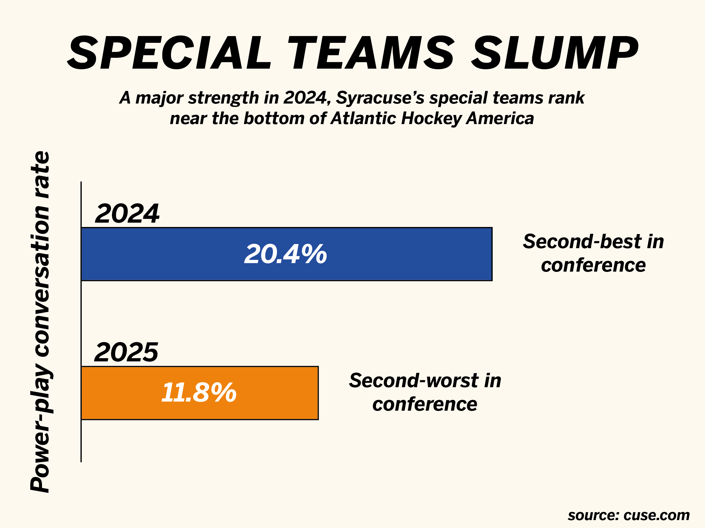 Six days earlier, in a 5-1 loss to then-No. 7 Quinnipiac, the Orange surrendered two tallies on seven Bobcat power plays.