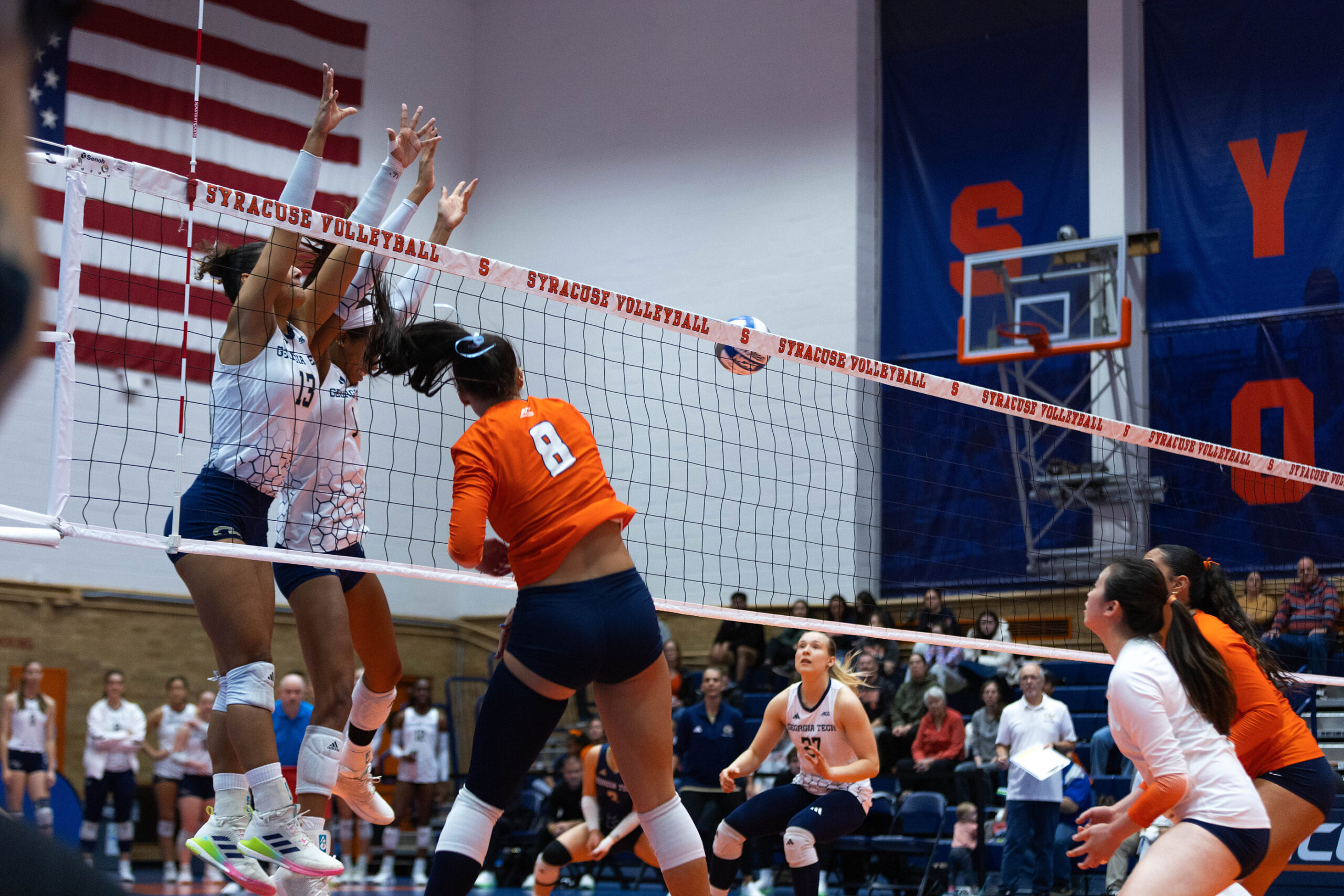Skylar George slams the ball in Syracuse’s loss to Georgia Tech on Nov. 9. The junior has recorded 295 kills, 247 digs and 32 service aces across two seasons with the Orange, also embracing NIL opportunities. Tara Deluca | Staff Photographer