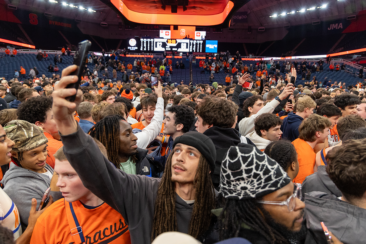 As SU’s bench interlocked arms and Autry paced up and down the sideline, Kyle missed his first attempt. But Kyle trusted his routine. The second shot touched nothing but nylon. The Orange maneuvered back on defense and forced a miss, sending the JMA Wireless Dome into a frenzy. As fans, flagged by stadium security, surrounded the perimeter of the court, Sadiq White split the pair. A long heave to Ament connected, but his buzzer-beating shot missed the mark. Autry earned his victory.