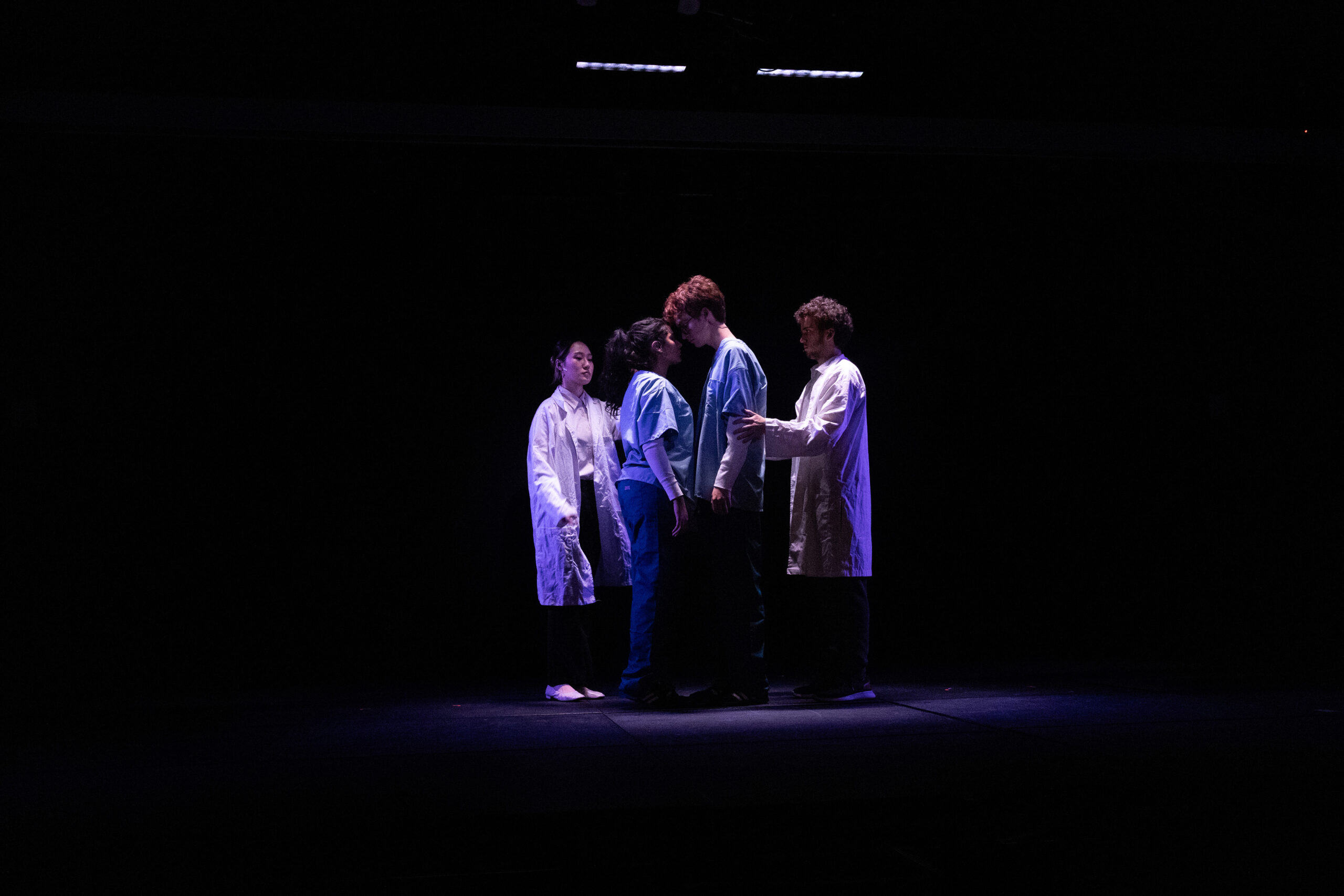 Two students are forcibly pulled away from each other by two other cast members in an opening sequence marked by lights flashing back and forth. Onstage, Priyanka Oomman, dressed in a hospital gown, takes a sharp breath.