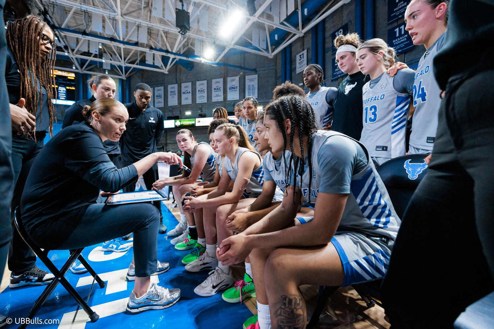 Kristen Sharkey instructs the Bulls during a timeout. After interviewing for Buffalo’s head coaching position, Sharkey was selected over several sitting head coaches. Photo by Paul Hokanson | UB Athletics