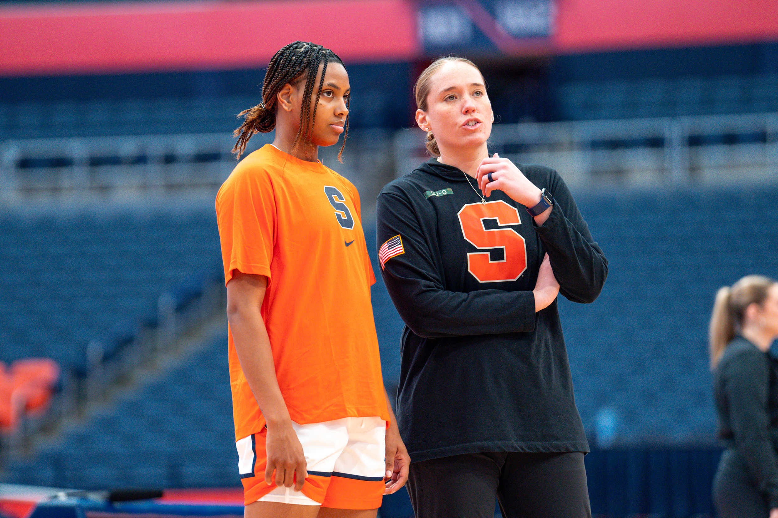 Before SU’s contest with Fairleigh Dickinson on Nov. 17, 2024, Kristen Sharkey converses with Syracuse wing Shy Hawkins. Sharkey’s interpersonal relationships have helped her evolve into a high-level recruiter. Courtesy of SU Athletics